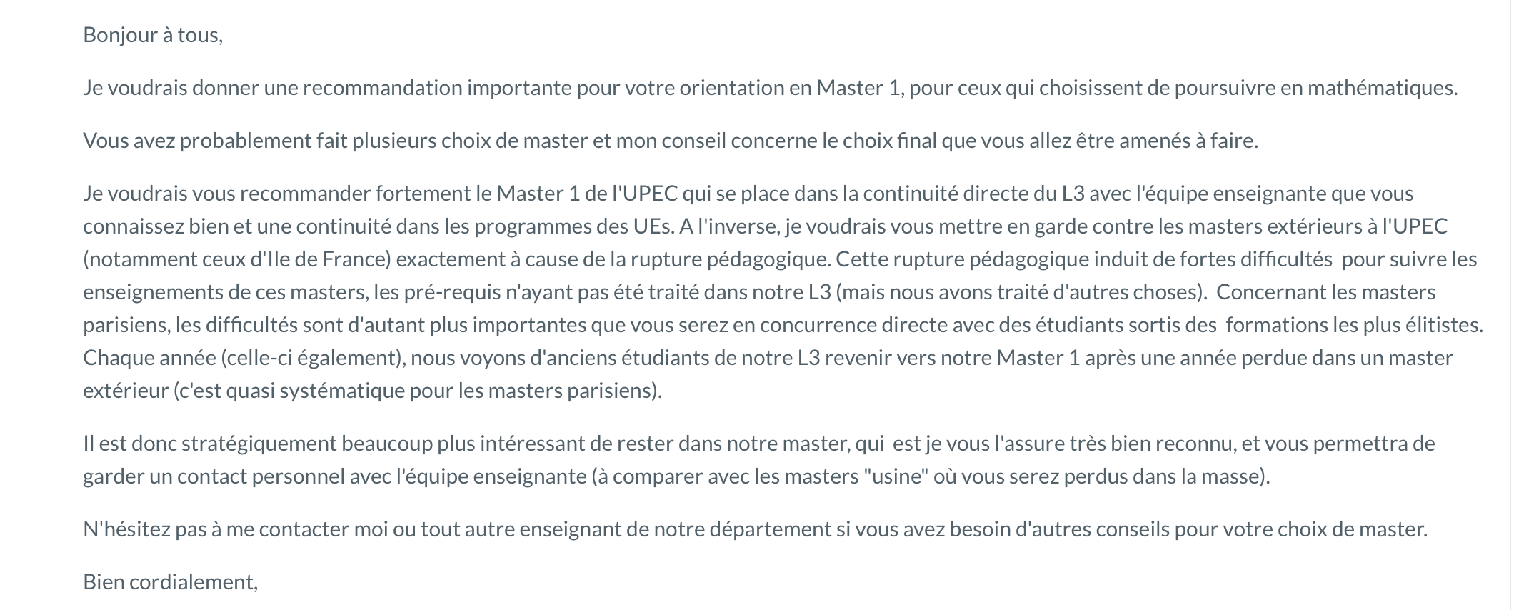 Surtout qu'il ne dit pas les masters parisiens en question. C'est déjà bof si on parle de gros masters élitistes mais soit, je doute qu'ils prennent des jean-upec dans ce cas là.