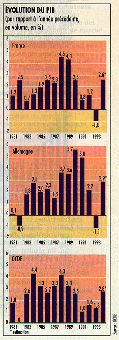 La croissance française est alors soutenue par le boom provoqué en Europe continentale par la réunification allemande, mais la médaille a son revers. La politique restrictive menée à partir de 1991 par la Bundesbank casse la croissance et aggrave encore les effets de la récession mondiale sur l’économie française : la croissance plonge en 1993 à - 1 %, un record depuis la Seconde Guerre mondiale. 1994 est l’année de la reprise, avec une croissance supérieure à 2,5 %. Au total, la France de 1995 est donc bien plus riche que celle de 1981. La montée de la pauvreté et de l’exclusion, c’est aussi une question de partage des richesse