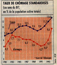 L’entreprise France tourne avec 22 millions d’actifs alors que plus de 25 millions de personnes souhaiteraient travailler. Le chômage a doublé entre 1981 et 1994, passant de 1,6 à 3,3 millions. Certes, les gouvernements qui se sont succédé ont toujours eu de bonnes excuses : l’éclatement de la bulle financière américaine, la réunification allemande... D’où la question : puisqu’il se passe toujours quelque chose qui empêche de recueillir les fruits de la désinflation compétitive en terme de croissance et d’emploi, n’aurait-il pas fallu mener une politique de l’emploi qui compte aussi sur d’autres leviers : la réduction du temps de travail, le développement d’emplois de services. Observons enfin que l’Allemagne (hors länder de l’Est) a obtenu de biens meilleurs résultats avec une croissance cumulée sur la période à peu près équivalente.