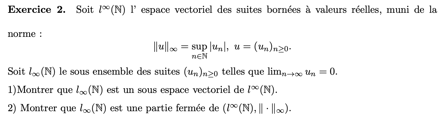 2) Soit u = (u_n) un élément adhérent à l_oo(N). Tu veux montrer que cette suite converge vers 0.