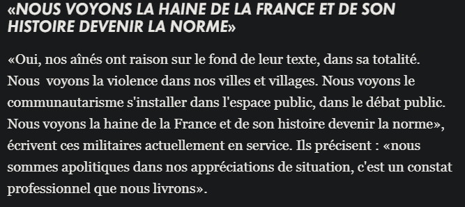 Là c'est juste du pipeau, à part du blabla vite fait sur cnews, yorarien.Tu racontes n'importe quoi il y'a évidemment eu des vérifications que les signataires étaient bien militaire