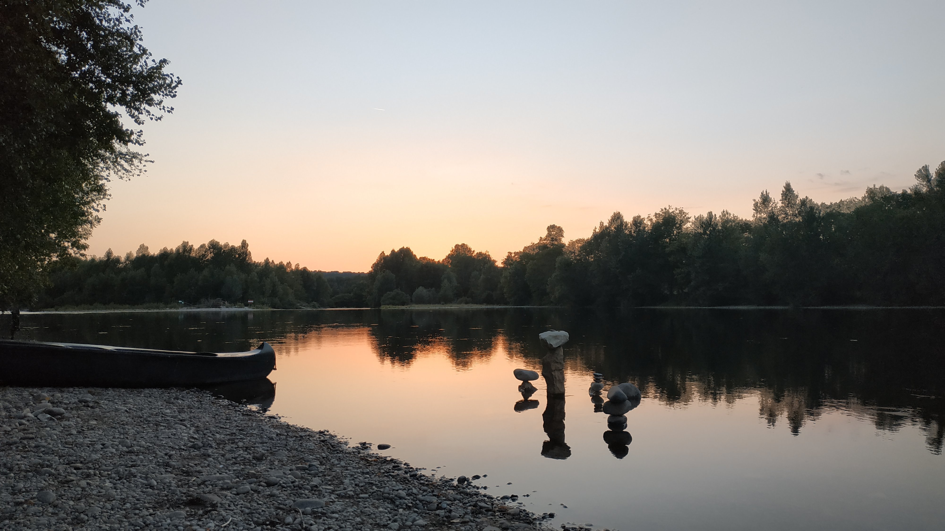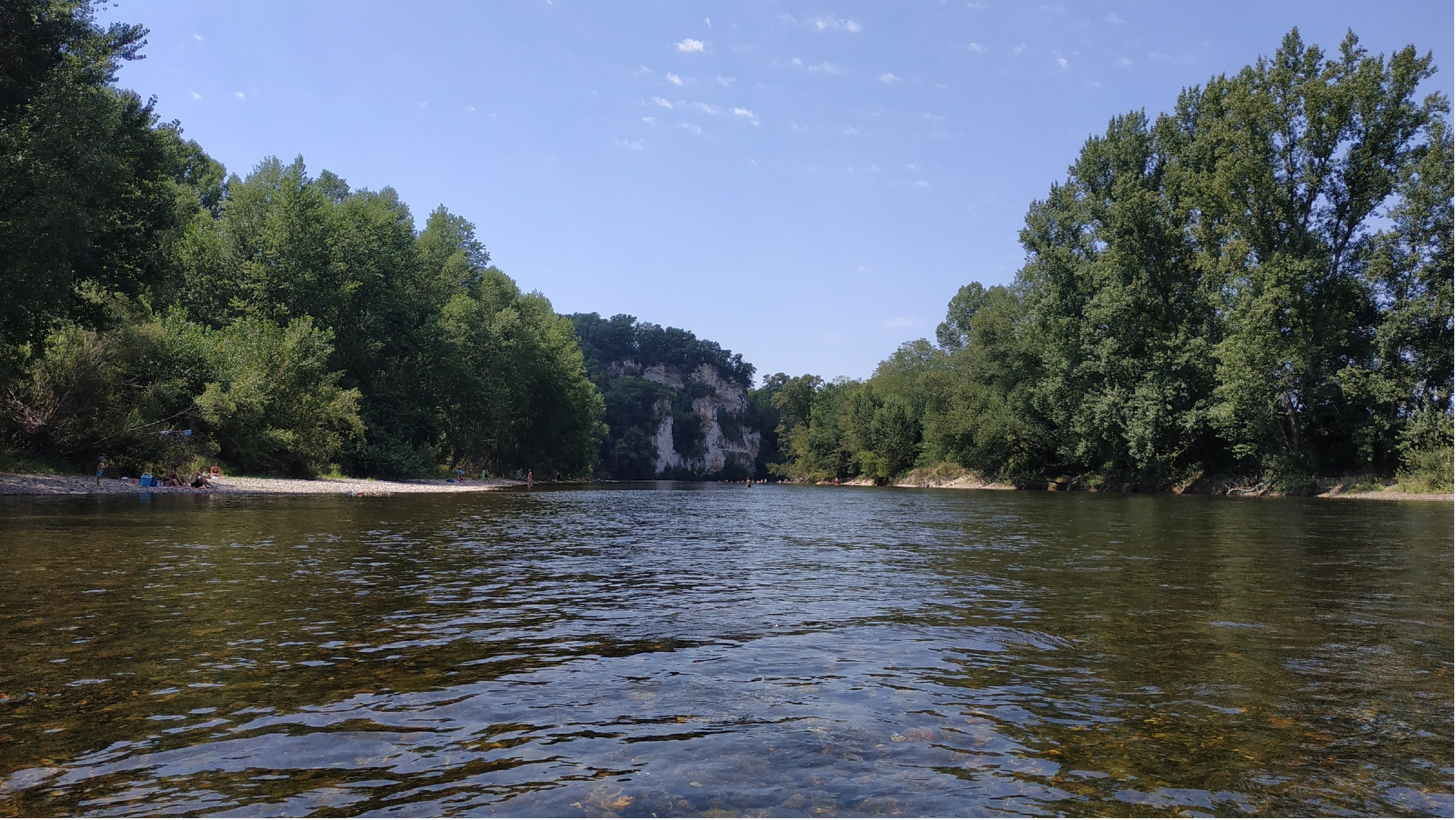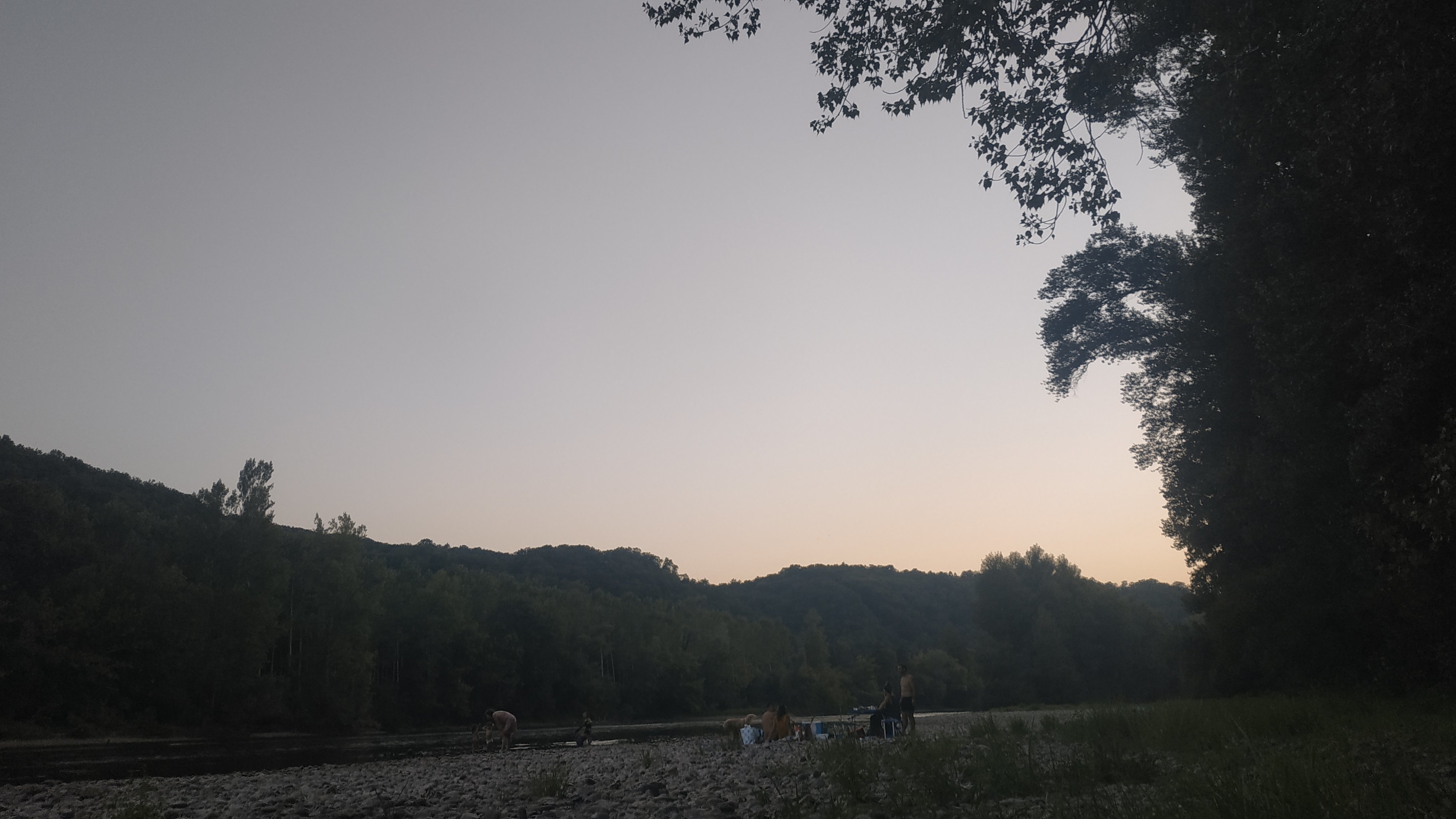 Le lendemain, nous continuons notre road trip. On s'arrête assez tôt, contrairement aux autres jours. Vers seize ou dix-sept heure, on trouve une plage sur le bord de la Dordogne. Il y a de l'herbe, puis une petite plage de galets de quelques mètres de long. On se baigne et on se lave, l'eau est à une température vraiment agréable et c'est l'un des fleuves le plus propre de France : l'eau est parfaitement translucide