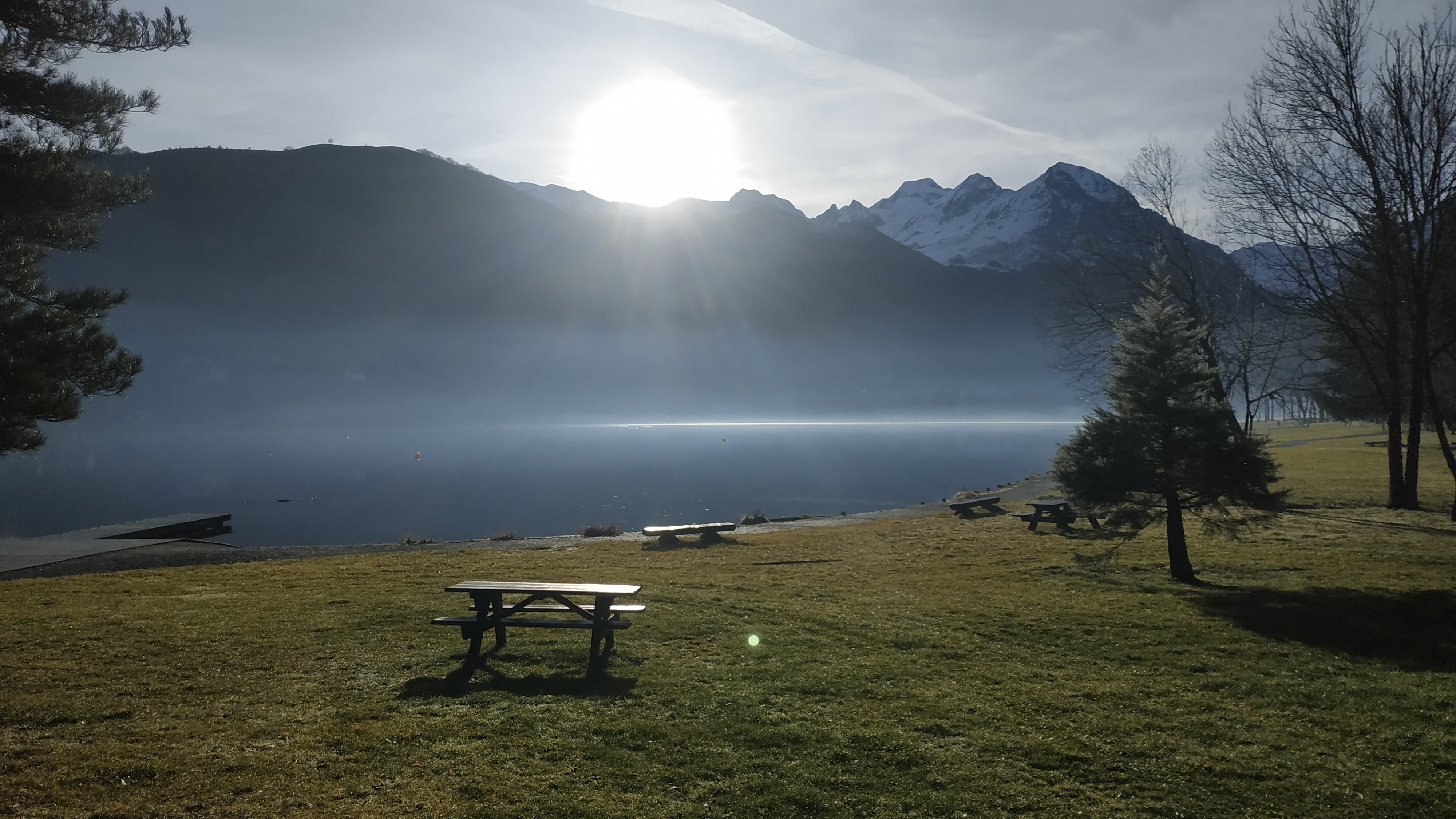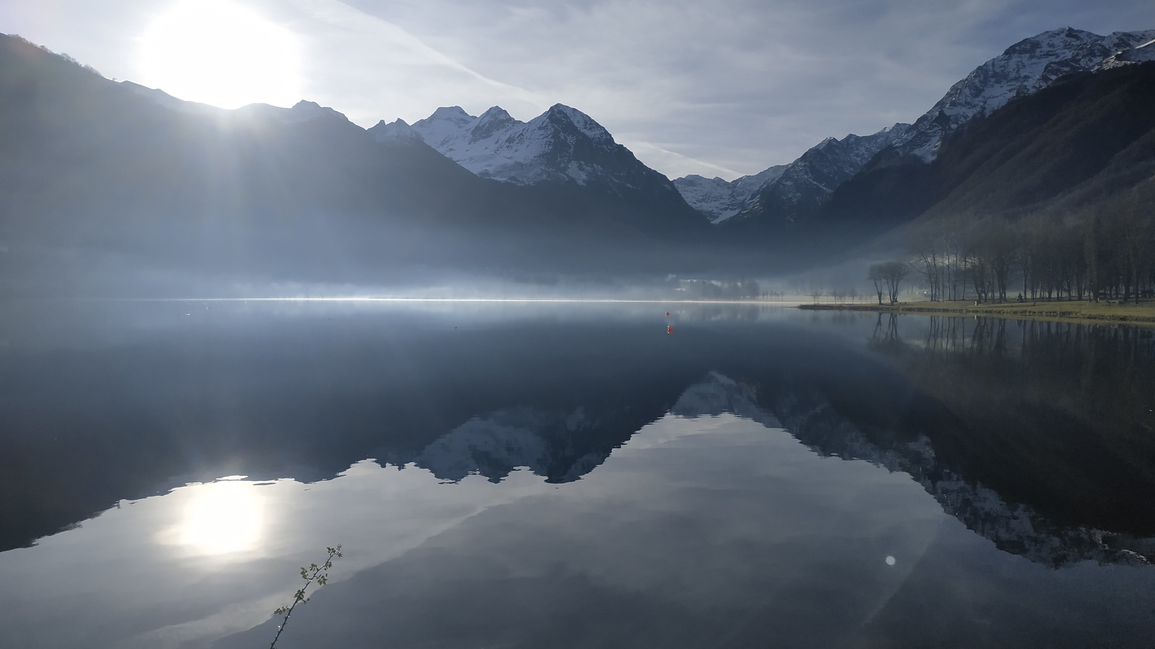Comme le jour est en train de se lever, il rase les montagnes. Sa position oblique par rapport à nous fait se dessiner sur le lac un trait lumineux. Les rayons du soleil, réfléchis par l'eau, font appercevoir la brume au loin