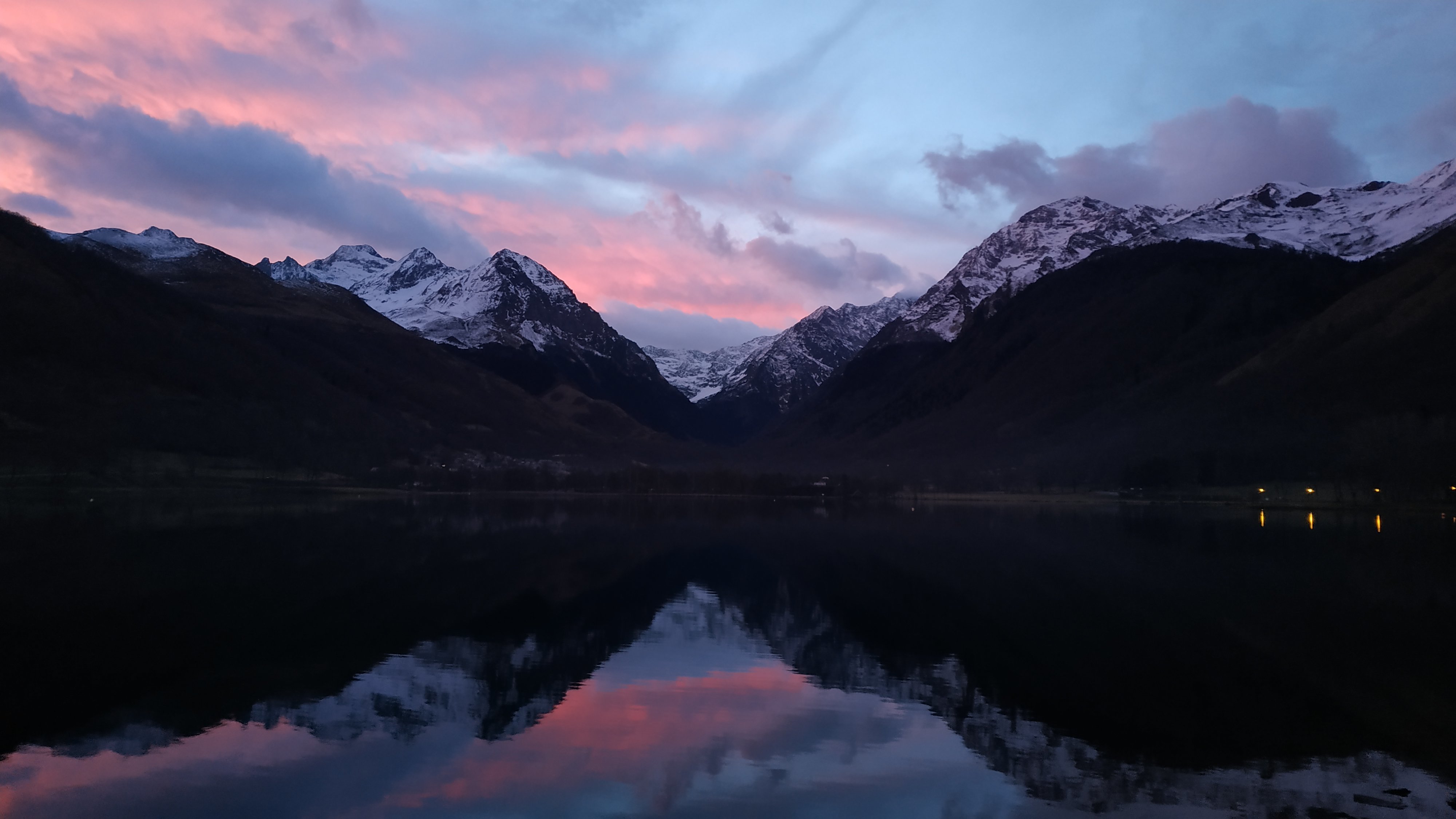 La nuit tombée, ce même paysage montre un tout autre visage. Les montagnes ne sont que des ombres lointaines, l'eau reflète un tapis d'étoile et une puissante lune, et les quelques lumières humaines – dont certaines sont un peu en hauteur – forment comme des bougies autour du lac. Un soir, je me pose sur le ponton du lac avec de la musique dans les oreilles. Puis je vais chercher Lucie et la motive pour aller voir ce joli spectacle et faire une petite balade autour du lac