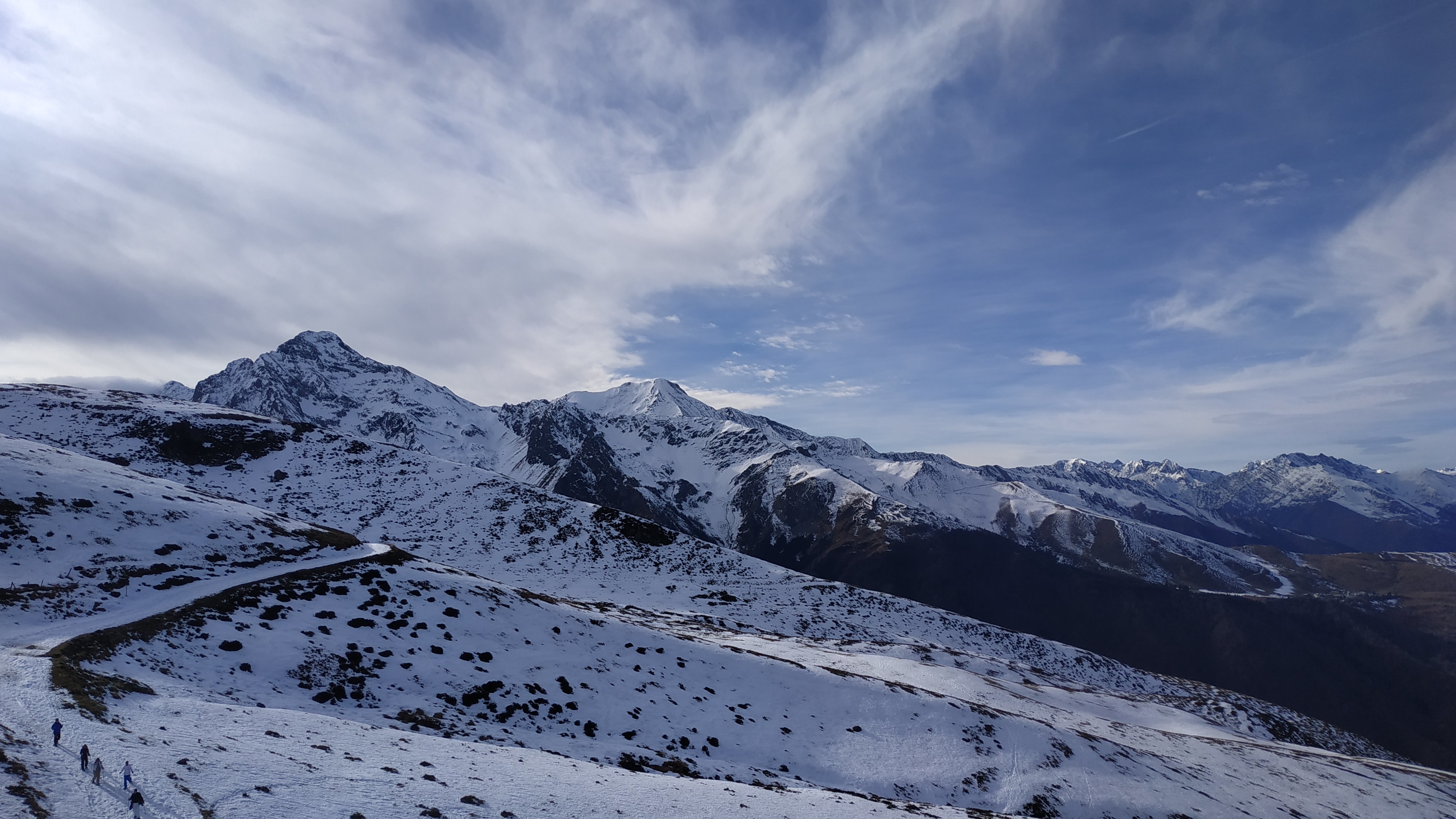 Nous prenons le téléphérique, arrivons sur la station de ski, et entammons notre randonnée. Elle va durer environ trois heures. Malheureusement, les photos prises par un téléphone portable manquent cruellement de profondeur, mais voici tout de même une photo de la vue durant une petite pause pour manger