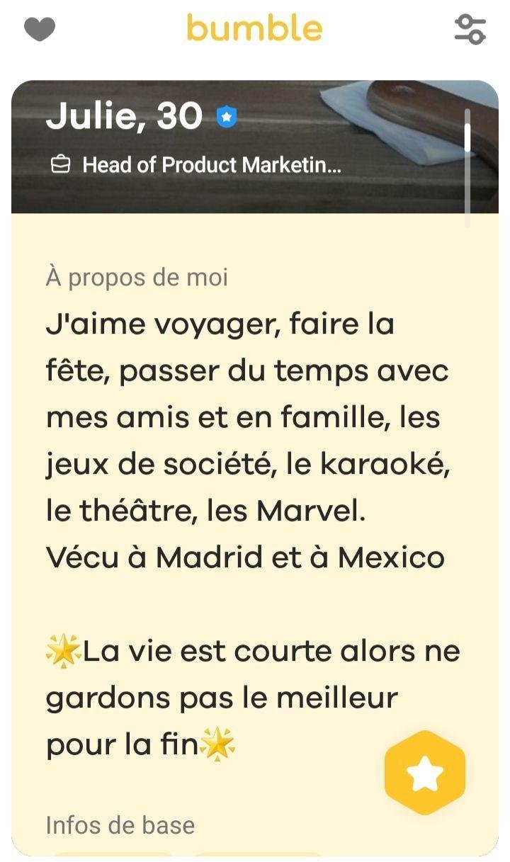 Encore une fois, juste pour qu'on soit clair, il nous est important d'écouter les motivations de Julie par rapport au vide astrale de sa description Tinder