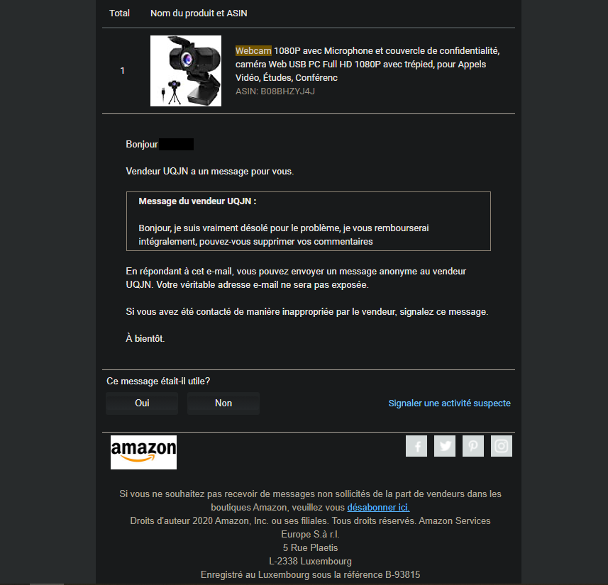 Deux heures après il ma contacter par mail en mode "modo supprime stp" pour me rembourser + webcam offerte