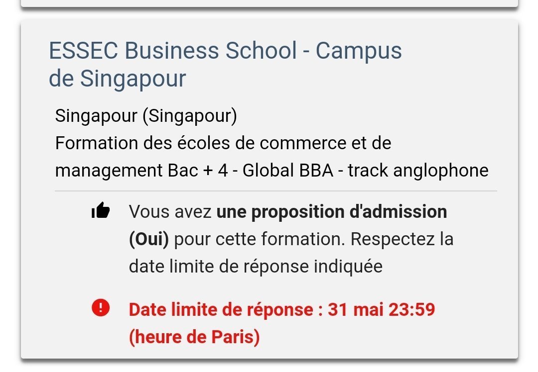 Après si ta famille est plutôt prolo / classe moyenne va plutôt à Science Po car bachelor à l’ESSEC puis master sûrement dans une autre esc ça doit être hors de prix. Tu peux te retrouver facilement endetté de 100k€voir plus si tu vas à Singapour