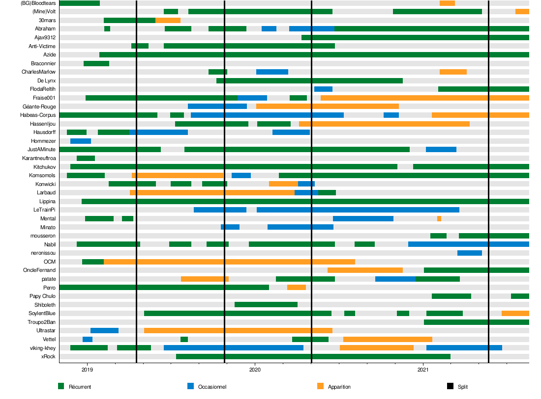 Avec tout çà à jour, j'ai pu me lancer dans le confection de la timeline de l'activité des principaux quizeur, il suffit de faire une recherche par pseudo dans le gdoc, et d'évaluer l'activité au cours du temps. J'ai décidé de découper ça en 3 niveaux d'activité : récurrent, occasionnel et apparition. Bien entendu, la limite entre les 3 niveaux et floue et parfaitement arbitraire, je cependant essayer de faire au mieux selon mes souvenirs. Je vous invite à refaire l'exercice et à me proposer autre chose si vous n'êtes pas d'accord avec mon attribution.