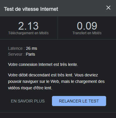 Tu peux te le carrer au cul ton speedtest, tout le monde ici sait très bien que répondre en 4 secondes ce n'est pas avoir une mauvaise connexion