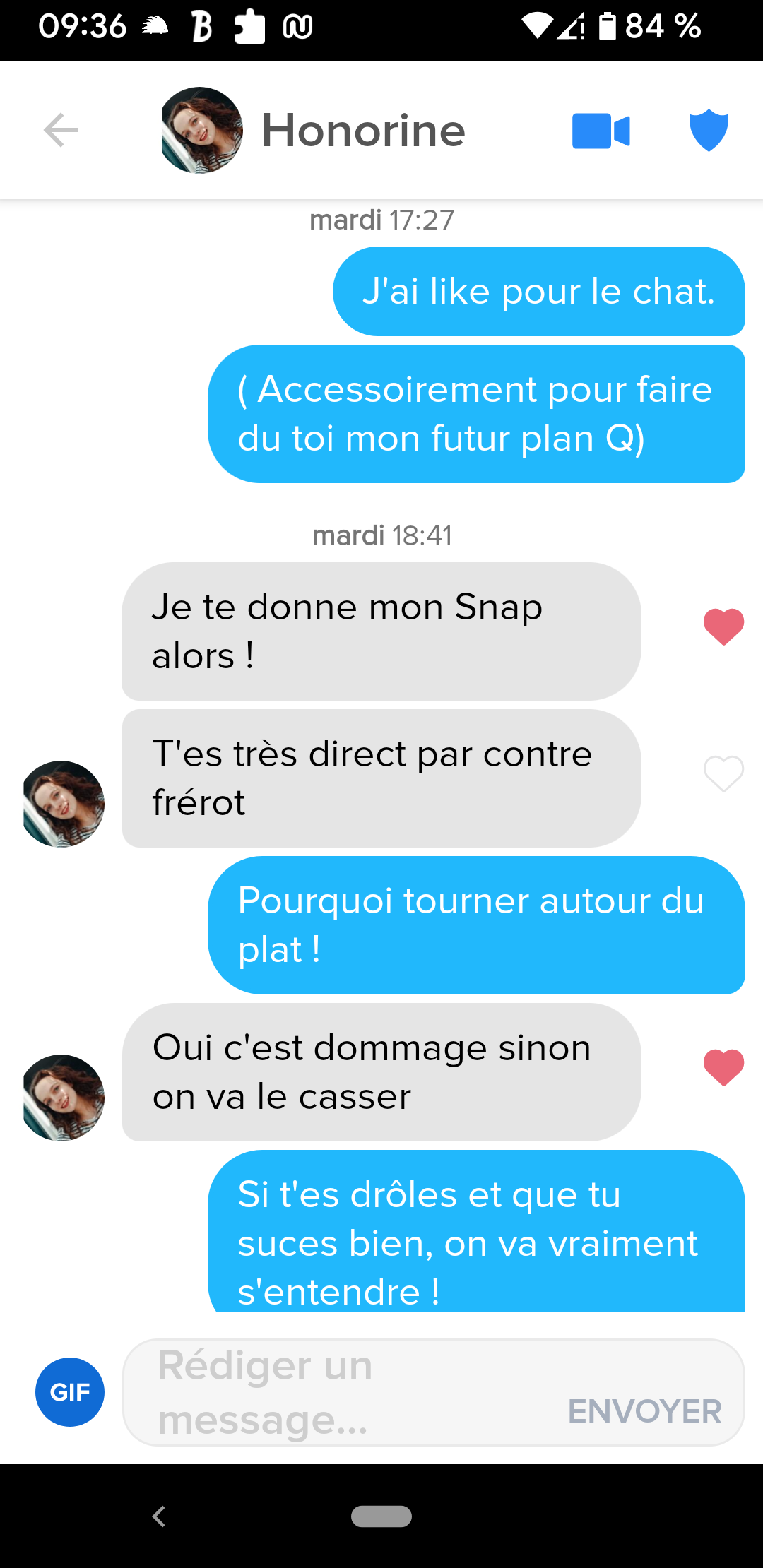 > Une fois j'étais avec une meuf tinder justement, que j'avais ken et elle a voulu voir mon tinder sur mon portable, et elle a demandé a mes match d'envoyer des nudes, j'ai eu genre 10 refus et 2 nudes