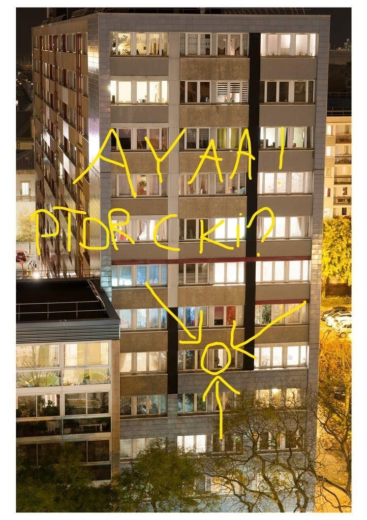Bon, go bâtiments en bas à gauche, 3ème étage, les 2 premières fenêtres