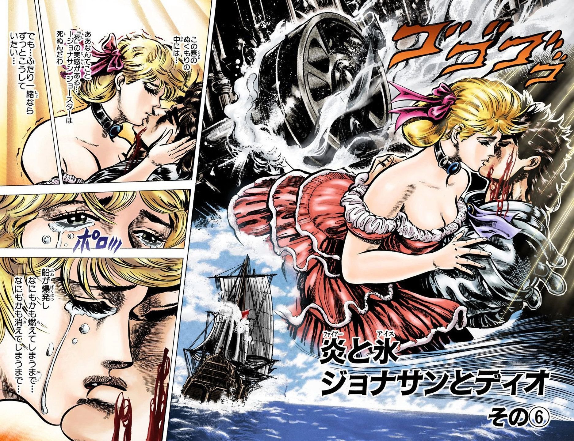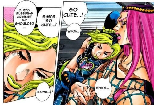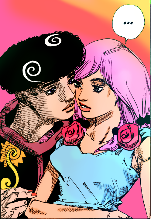 Donc pour commencer, il faut attendre Golden Wind pour voir enfin les premiers gays. Tout d’abord, Gelato et Sorbeto qui n’est pas l’image idéale d’un couple gay, la seule vignette où on les voit, on dirait deux diablotins (ce qui est au final cohérent avec la Passion dirigée par littéralement « Diable » en italien). Puis, nous avons pleins de relations plus ou moins bizarres (lol) avec Prosciutto et Pesci, mais qui est surtout une relation fraternelle malsaine. Nous avons aussi Cciocolatta et Secco, qui sont plus proche d’une relation sado-maso, mais qui surtout sont les déchets ultimes dans Jojo. Et par ailleurs, si on reprend l’analogie du boss = diable et donc la Passione = Enfer, qui découle de l’inspiration chrétienne de la partie 5, la garde rapprochée semble représenter des grands méfaits du christianisme. En prenant le sens inverse, Cciocolatta représente l’amour de la mort avec Secco. Carne représente la haine vengeresse poussée à l’extrême et insatiable jusqu’après la mort. Et Tiziano représente la destruction de la vérité, le mensonge, ainsi qu’avec Squalo la sexualité déviante en tant qu’homosexuels.