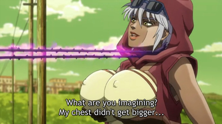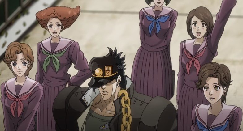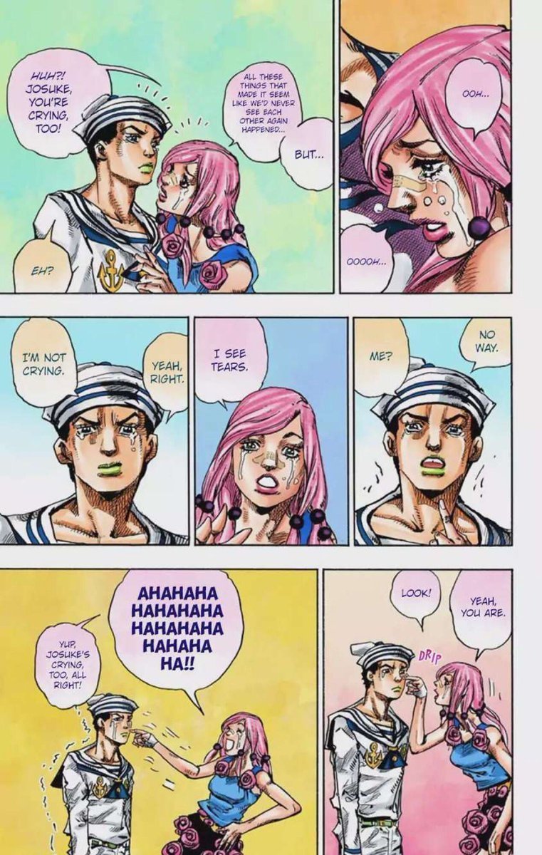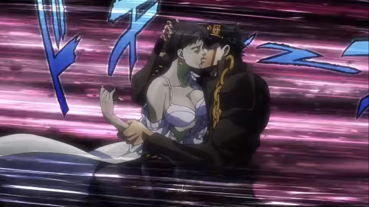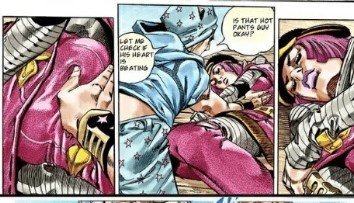 Mais avant tout, Stardust Crusaders nous montre cette fameuse scène entre Avdol et Joseph. Et tous les deux ne sont pas montrés sous leur meilleur jour. Ils ne veulent pas cela, et sont pris sous un maléfice d’un stand qui les rend ridicules aux yeux de tous. Avdol dit même « cela ne me ressemble pas. Ce n’est pas mon personnage ». Il est souillé. Donc ce gag est montré de manière bien plus négative qu’autres choses. Notons aussi qu’il y a la vieille homophobe toujours pour le gag.