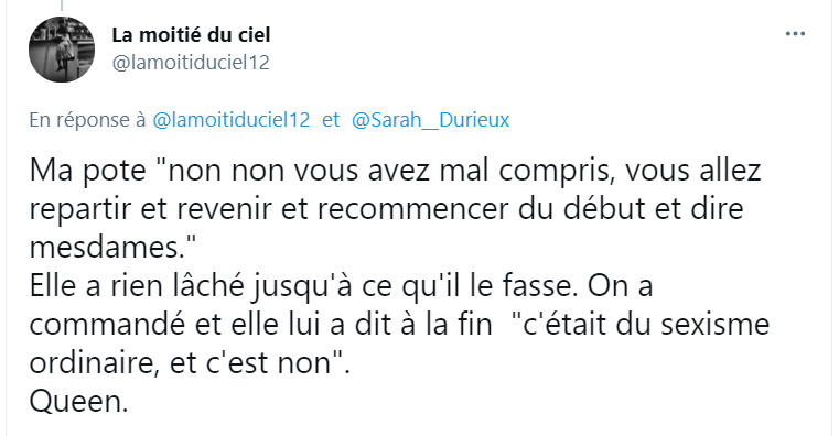 Le 09 juin 2021 à 15:38:36 :Je serai le serveur de la dernière je serai reparti et j'aurais attendu qu'un collègue prenne la relève sur cette table