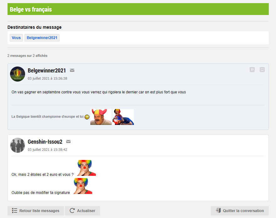 Tous vos meilleurs joueurs sont trentenaires, la défense est composée de vieux papys, Hazard est fini pour le haut niveau. Et AUCUNE relève derrière. Il semble bien que cette génération était exceptionnelle, un peu comme la république tchèque des années 2000. Donc je crois que pour vous l'arrogance c'est fini les belgix. Vous allez retourner dans les tréfonds du classement coucacoulaent que vous affectionnez tant, à votre niveau réel qui se situe à peu près entre l'Ukraine et le Kazakhstan. Et vous allez recommencer à supporter l'EDF.![]()