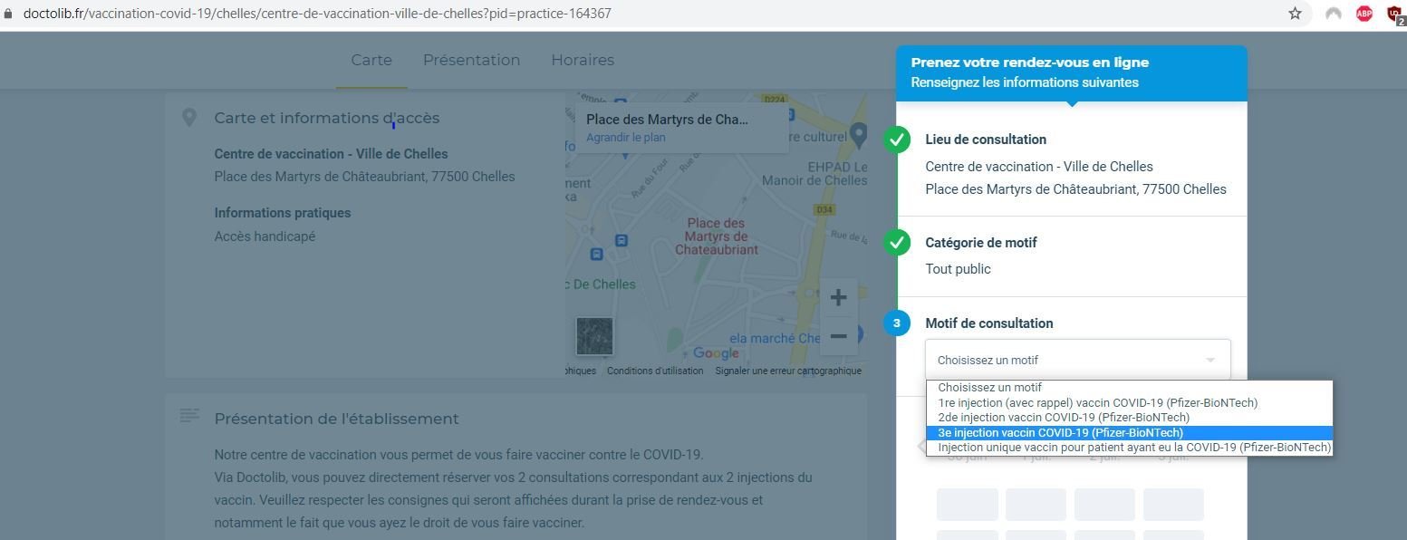 Le 30 juin 2021 à 23:13:44 : https://www.doctolib.fr/vaccination-covid-19/chelles/centre-de-vaccination-ville-de-chelles?pid=practice-164367 motif de consultation à droite -> 3eme dosepreuve: