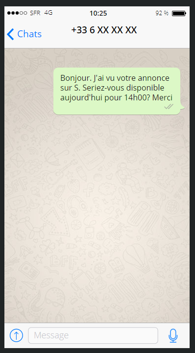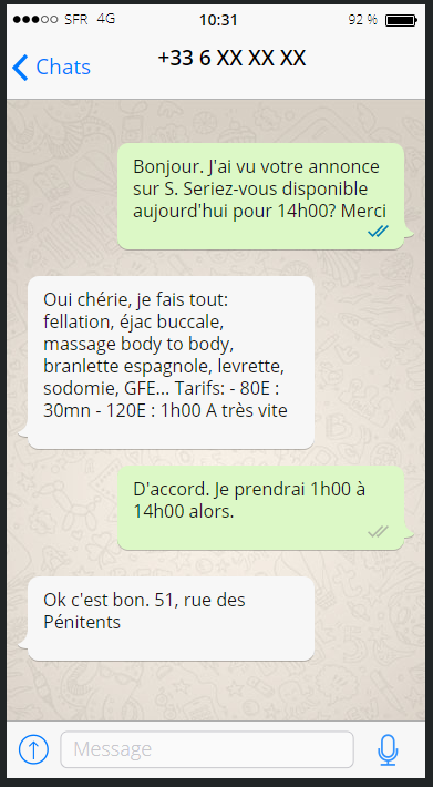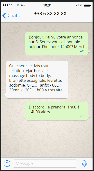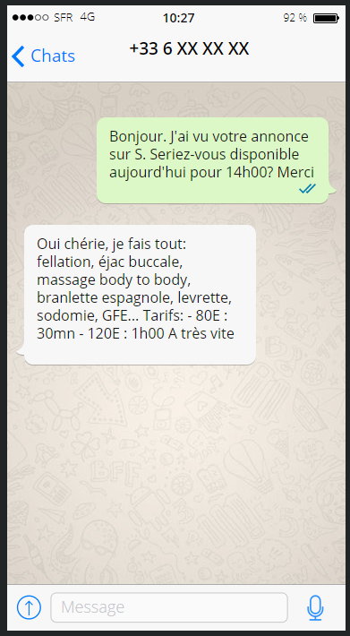 - Bon, une latina de 30ans. Bonnet D, un bon cul. Moyennement cher mais les commentaires ont l'air ok. Demain, y'a le pont donc j'enverrai un sms demain matin