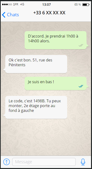 Bon, ça fait 5mn que je lui ai dis que j'étais en bas et elle répond toujours pas. Je commence à passer pour un gars chelou tout seul. Si elle répond pas d'ici 10 minutes, j'men vais