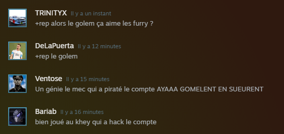 Feldup s'est fait hacké son compte Steam et ce fameux hackeur joue à des jeux de furry et envoie des photos de bite partout.