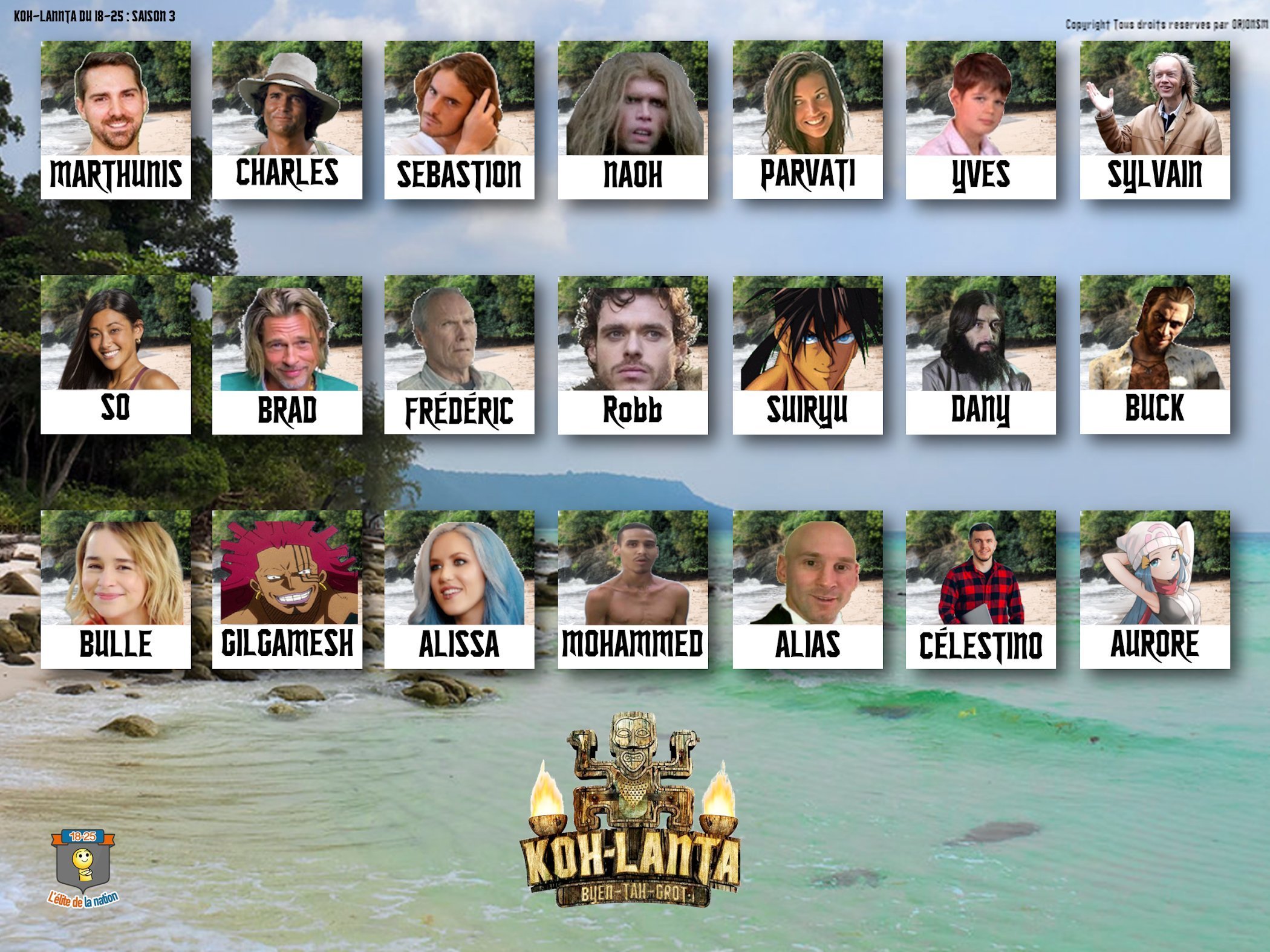 Bonsoir l’Élite, sur ce topic vous allez pouvoir suivre la diffusion de la troisième saison du Koh-Lanta du 18-25 intitulée Byen-Tah-Grot. (Lien de la saison 1 : https://www.jeuxvideo.com/forums/42-51-63810578-1-0-1-0-koh-lanta-du-18-25-saison-1.htm ; de la saison 2 : https://www.jeuxvideo.com/forums/42-51-65807641-1-0-1-0-fic-rp-koh-lanta-du-18-25-saison-2.htm .) Il s’agit d’un jeu de rôle se rapprochant très fortement de l’émission de TF1 présentée par Denis Trollard, sauf qu’au lieu de randoms/french-dreamers, il s’agit de clés qui se sont prêtés à ce jeu. Je vous promets une saison rocambolesque et pleine de stratégie. Car croyez-moi, ces 21 membres de l’élite ont tout fait pour devenir l’Ultime Survivant. Cette aventure vous allez pouvoir la suivre au rythme de deux épisodes étalés sur la semaine. Alors qui succèdera à Dovak ? Laissez-moi d’abord vous présenter les 21 candidats :