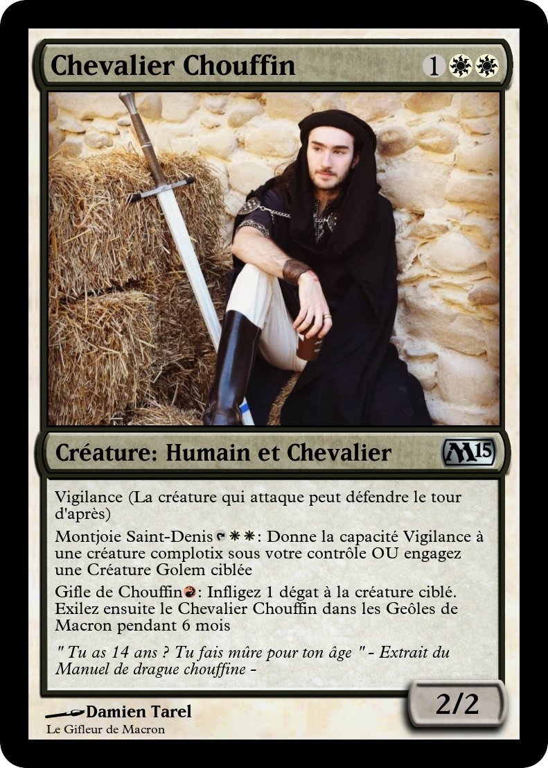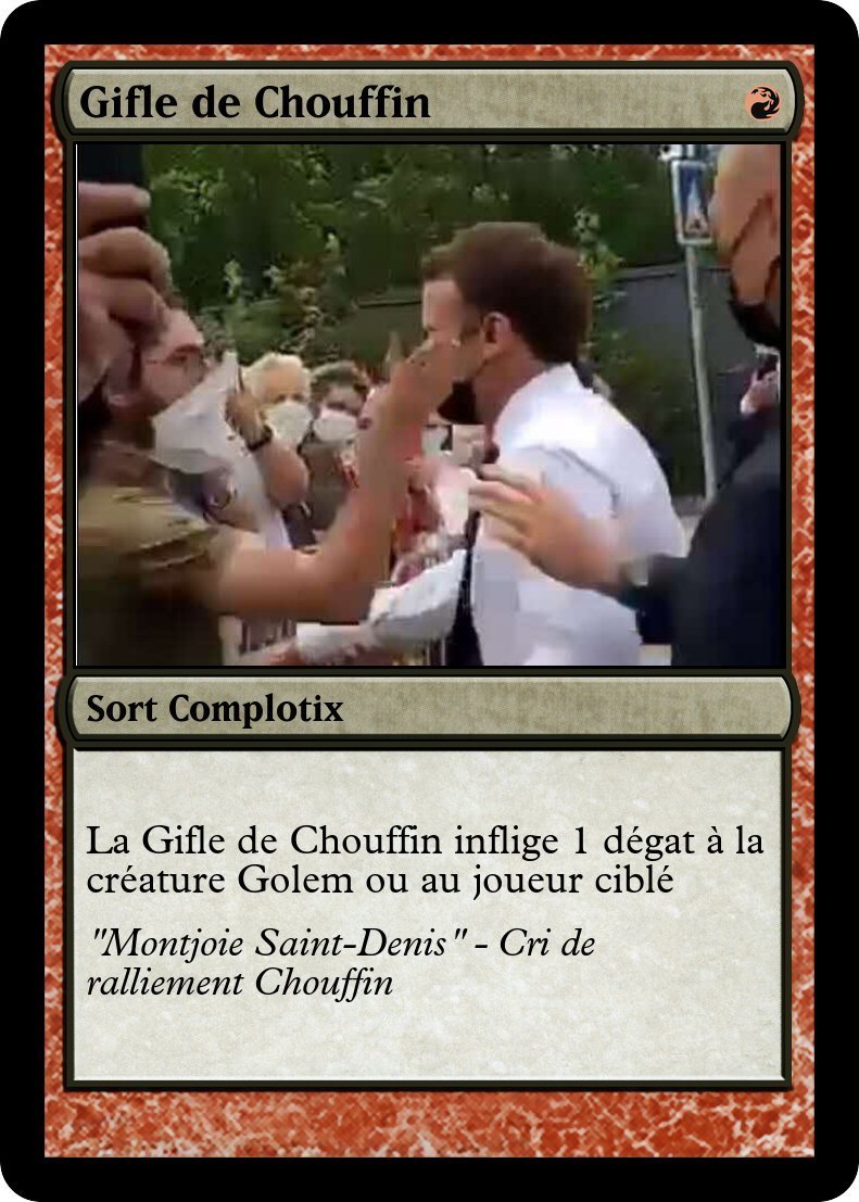 2 nouvelles cartes Complotix: La Gifle de Chouffin et le Chevalier Chouffin (pour la photo du chevalier chouffin c'est une photo officielle du mec qui a giflé Macron)
