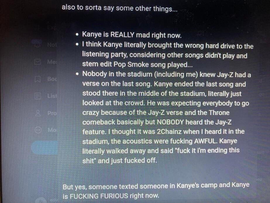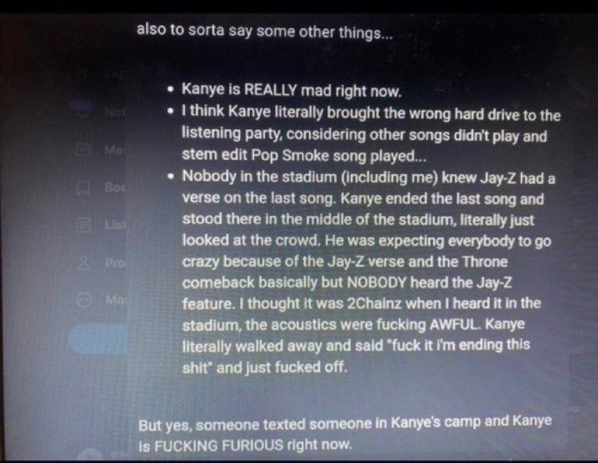 Résuméles plateformes forcent pour que ca sorte aujourd'hui mais ca devient de plus en plus improbable. D'après des proches de Kanye West il a très mal supporté le fiasco de l'événement d'hier, son équipe se serait trompé de disque dur pour la diffusion de l'album et aurait diffusé les demos et pas les chansons terminé. L'acoustique du stade était pas terrible et une bonne partie du public n'a pas compris que c'était Jay Z en feat sur le dernier son diffusé. Du coup Kanye West a rage quit et il s'est barrer a ce moment là. Donc on ne sait pas quand ca sort, aujourd'hui c'est très improbable, il a aussi fait appel a Mike Dean bien trop tard pour le mixage ca m'étonnerait que ce soit finit cette nuit. Rick Rubin est venu a la rescousse pour l'aider a finaliser tout ca mais pour Yeezus il lui avait bien fallut 2 semaines pour réorganiser tout ce merdier. Les réactions d'hier sons assez mitigé donc je vois pas Kanye West sortir l'album sur une mauvaise impression du publique. Il est censé l'interpreter au Rolling Loud dimanche donc a voir, faut pas oublier que Jesus Is King était sorti un mois après la diffusion test devant un public