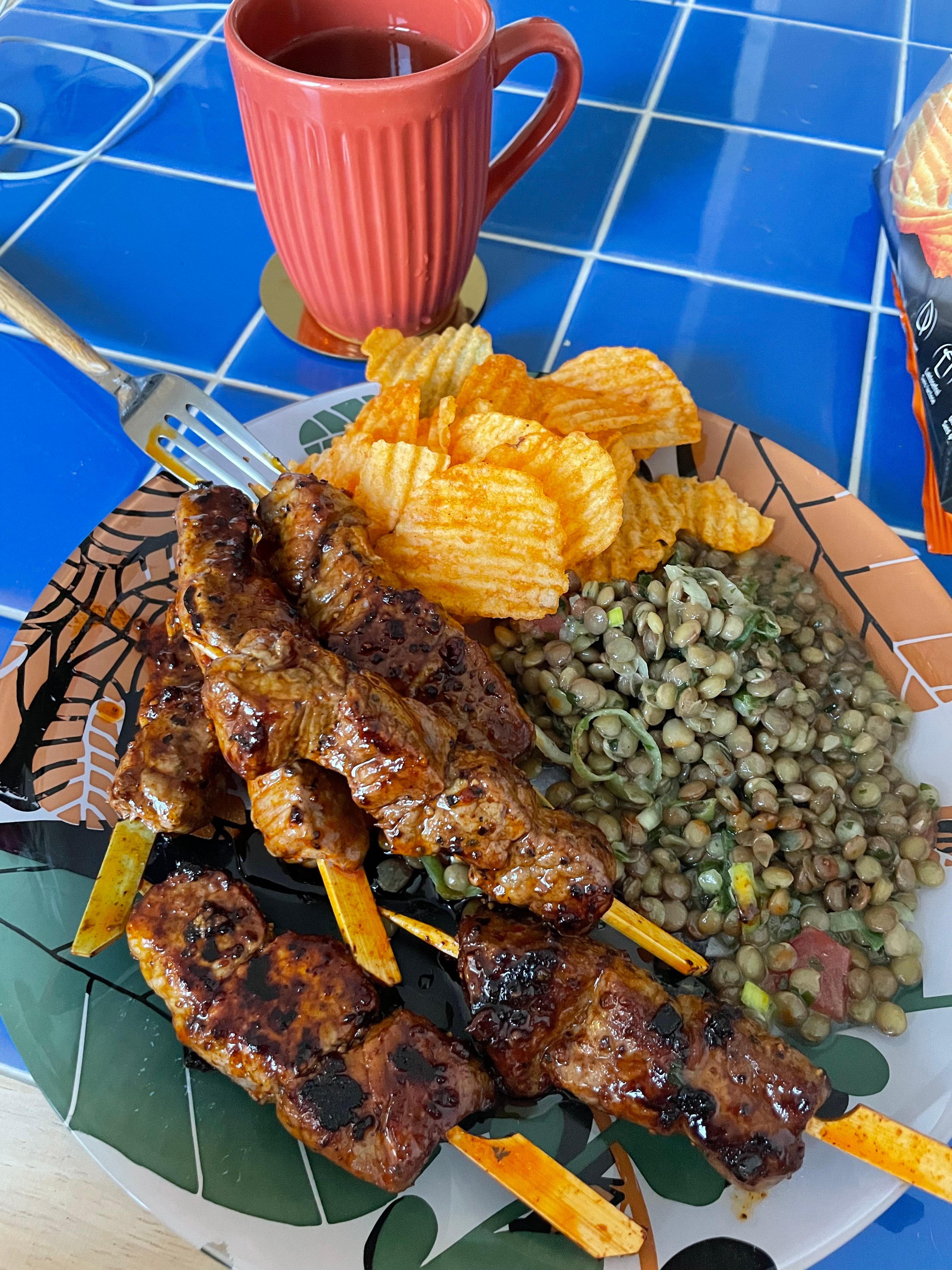 6 brochettes de viande marinée de la boucherieSalade de lentilleChips smokey paprika