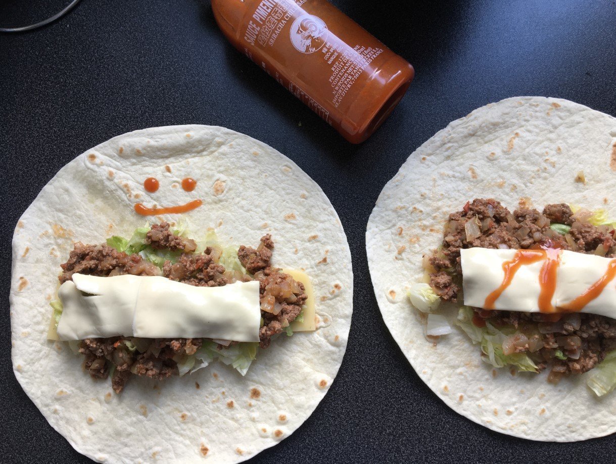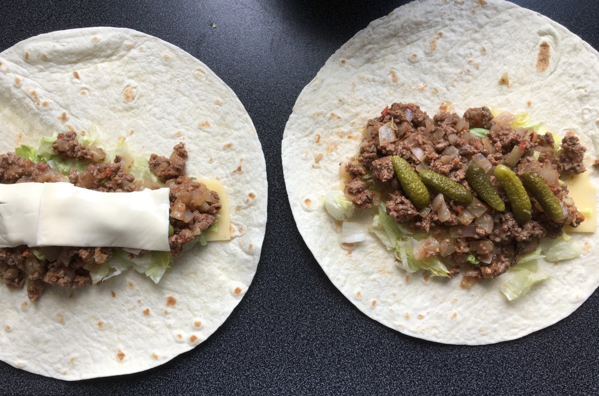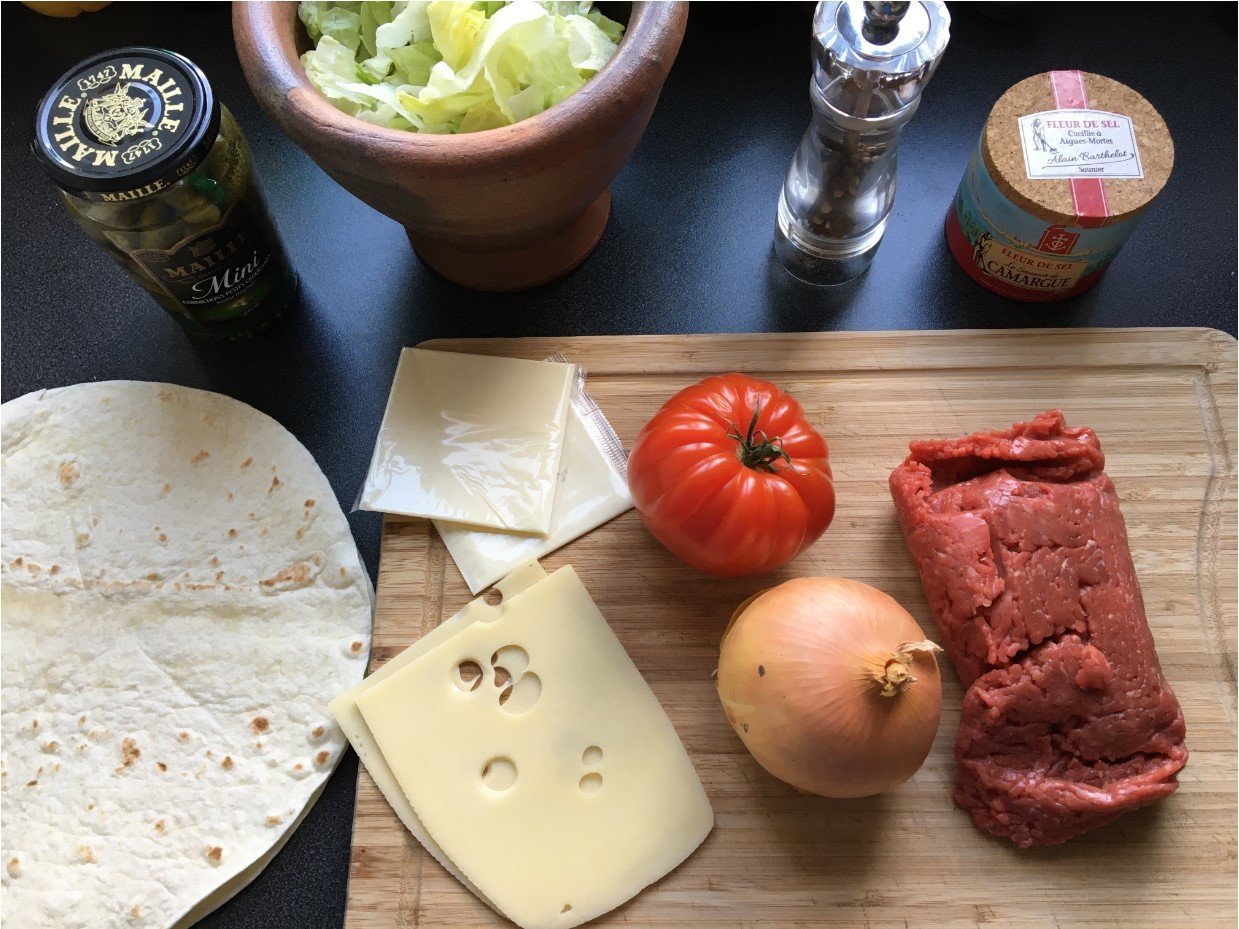recette pour 4 burritos, 350g de viandes hachées, 1 oignon, 1 tomate, de la salade, et évidement des galettes pour burritos