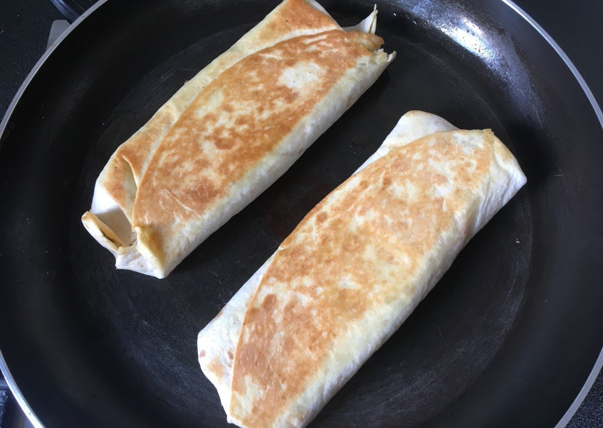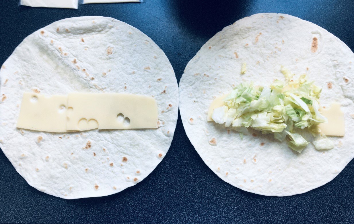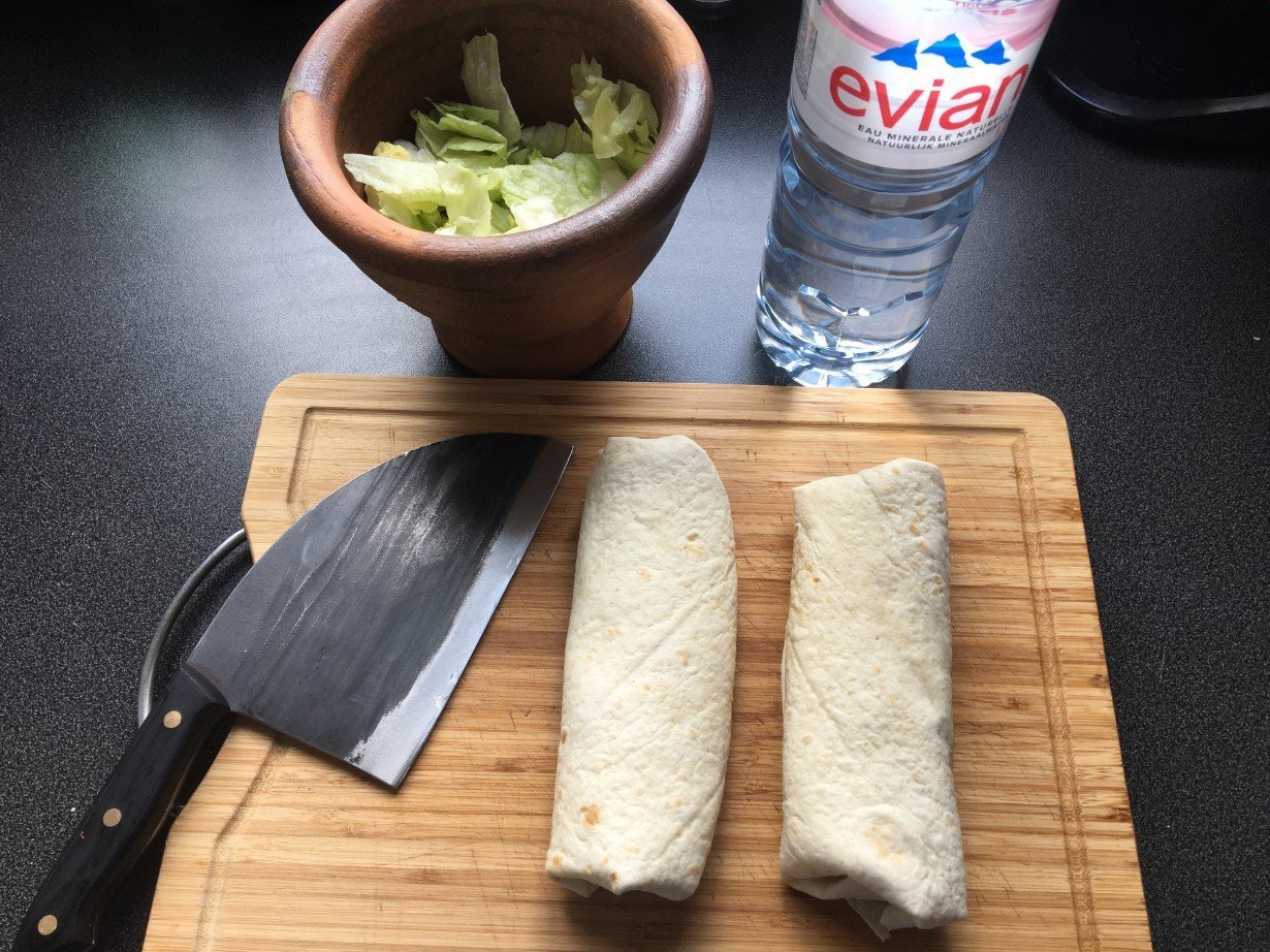 recette pour 4 burritos, 350g de viandes hachées, 1 oignon, 1 tomate, de la salade, et évidement des galettes pour burritos