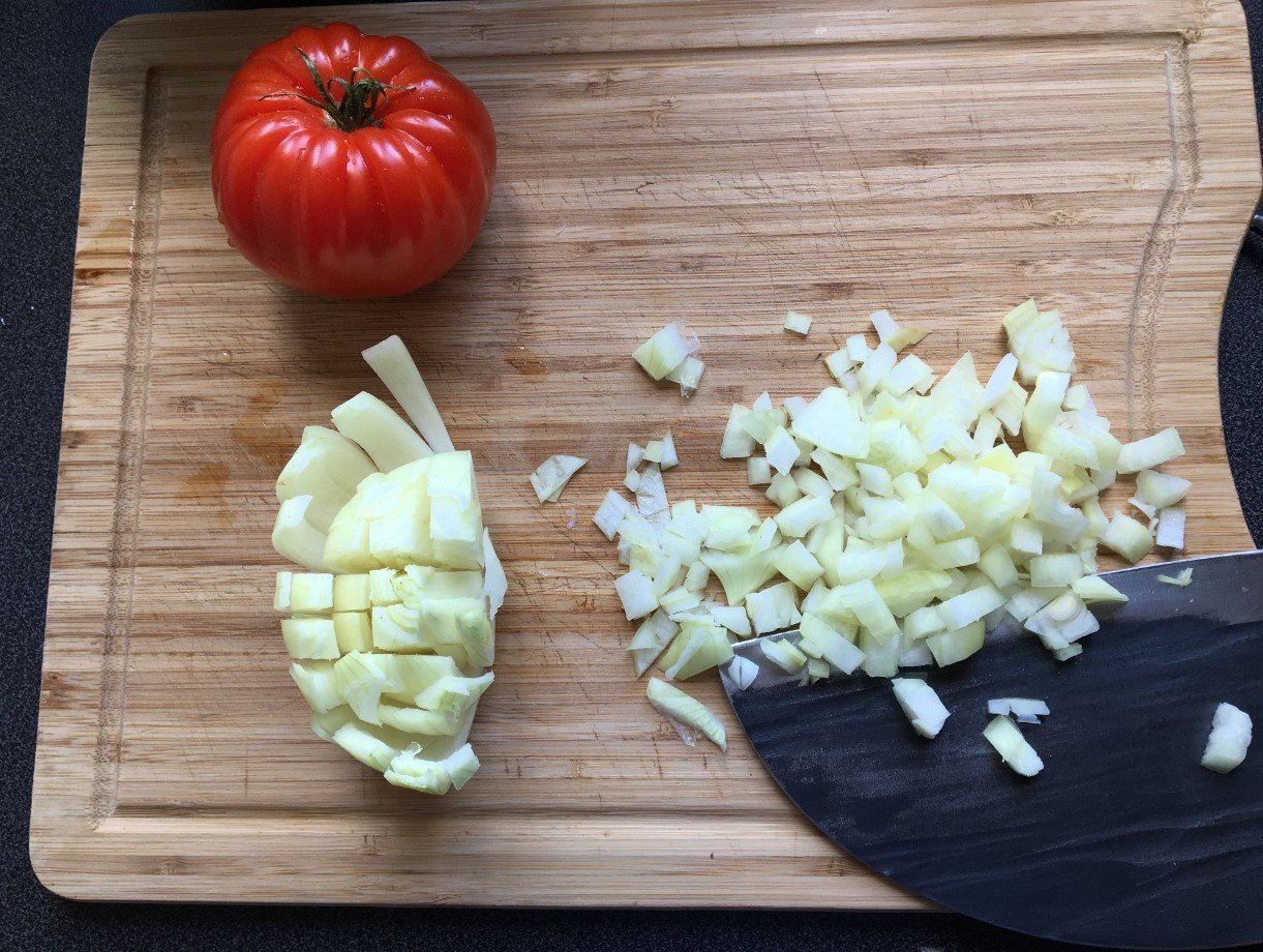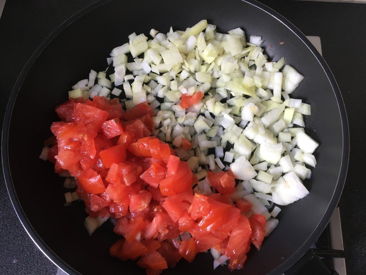 on commence par ciseler finement l'oignon et la tomate et on fait mijoter à feu fort