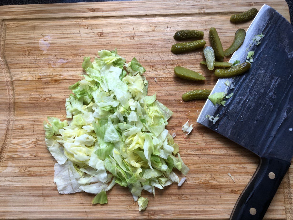 on passe au dressage, d'abord une tranche d'emmental, un peu de salade, je dépose ma préparation et dispose quelques cornichon, puis je fini avec une autre tranche de fromage américain, un peu de sauce piment pour le gout, les plus gourmants ajouterons la sauce qui leur plait