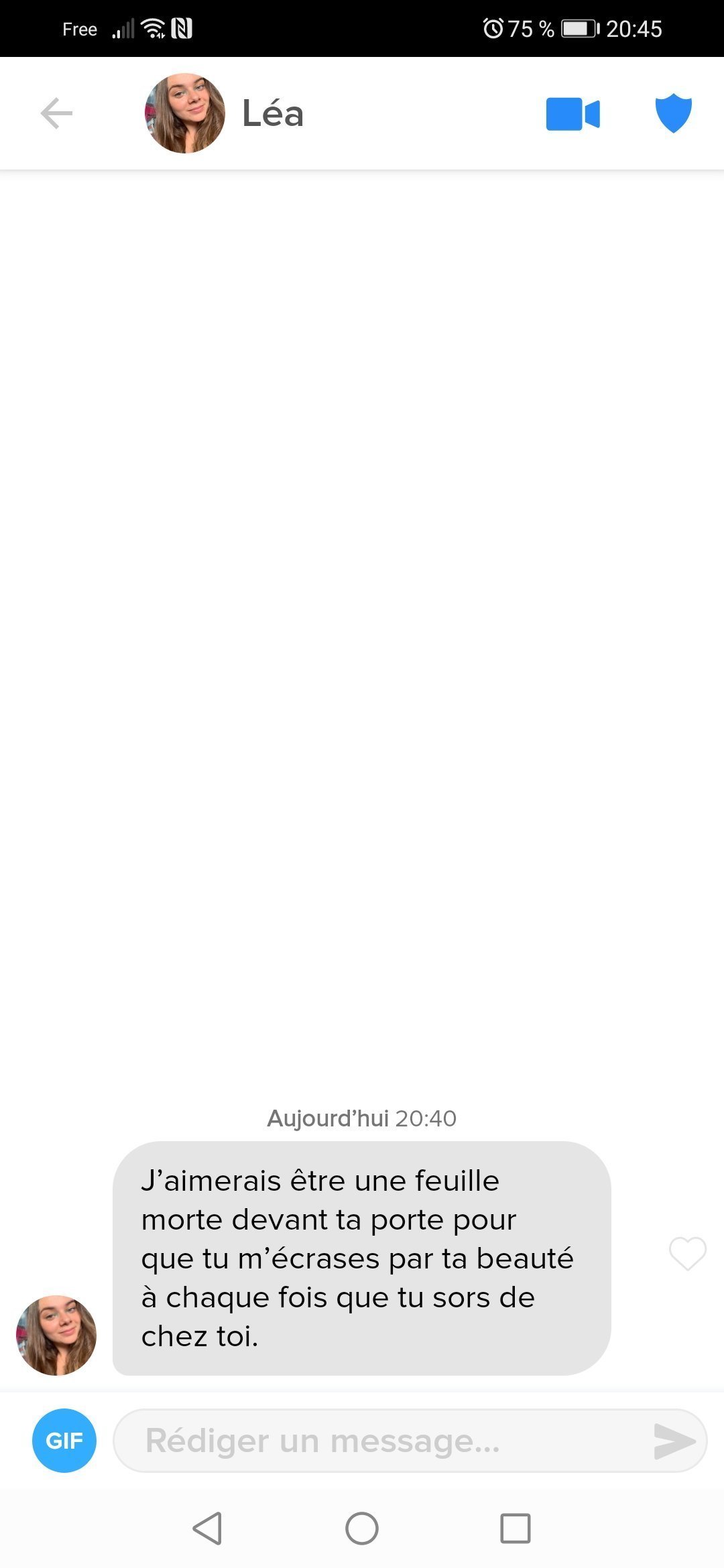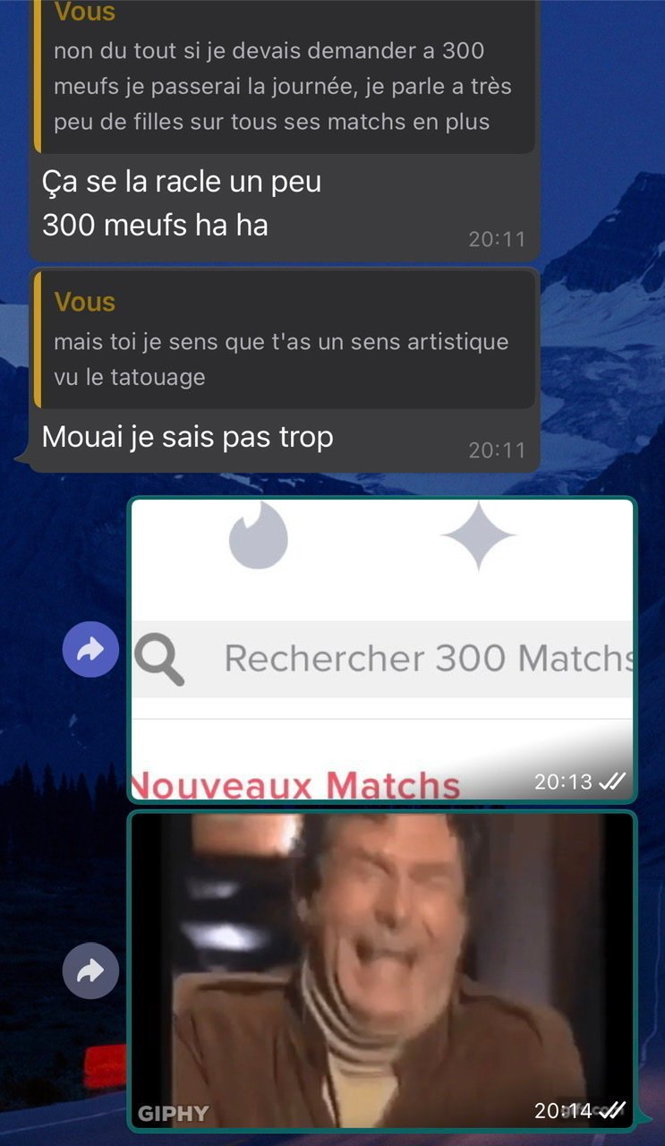Oui enfin les mecs vos fakebg de l'espace temps qui représente 0.01 % des hommes évidemment que toute les meufs vont mouiller dessus c'est logique hein pas la peine de faire les surpris avec vos screensMais du coup que je comprenne un truc car je suis pas du tout dans le délire Tinder.