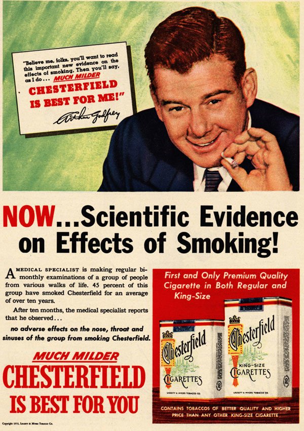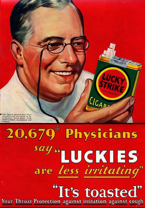 En effet, tout le monde a une confiance aveugle en son docteur pour les questions de santé. Durant plusieurs décennies, la publicité s’est donc échinée à représenter des docteurs pour nous rassurer. Voici une compilation de publicités publiées principalement entre 1930 et 1960 aux Etats-Unis que l’industrie du tabac doit regretter aujourd’hui ! L’intégralité de ces publicités provient de l’excellente base de données de l’Ecole de Médecine de Standford.