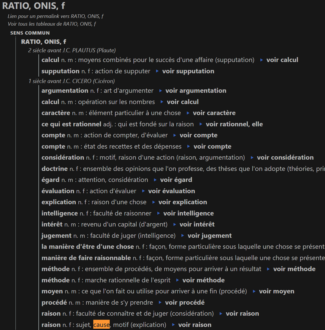 Non, là tu dis que raison peut donner "causa" en latin. Si on fait la même recherche avec le mot ratio on tombe sur ça : https://www.dicolatin.com/Dico/LatinFrancais