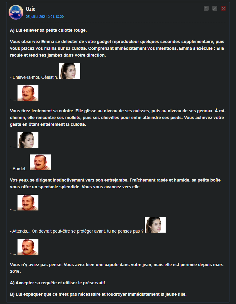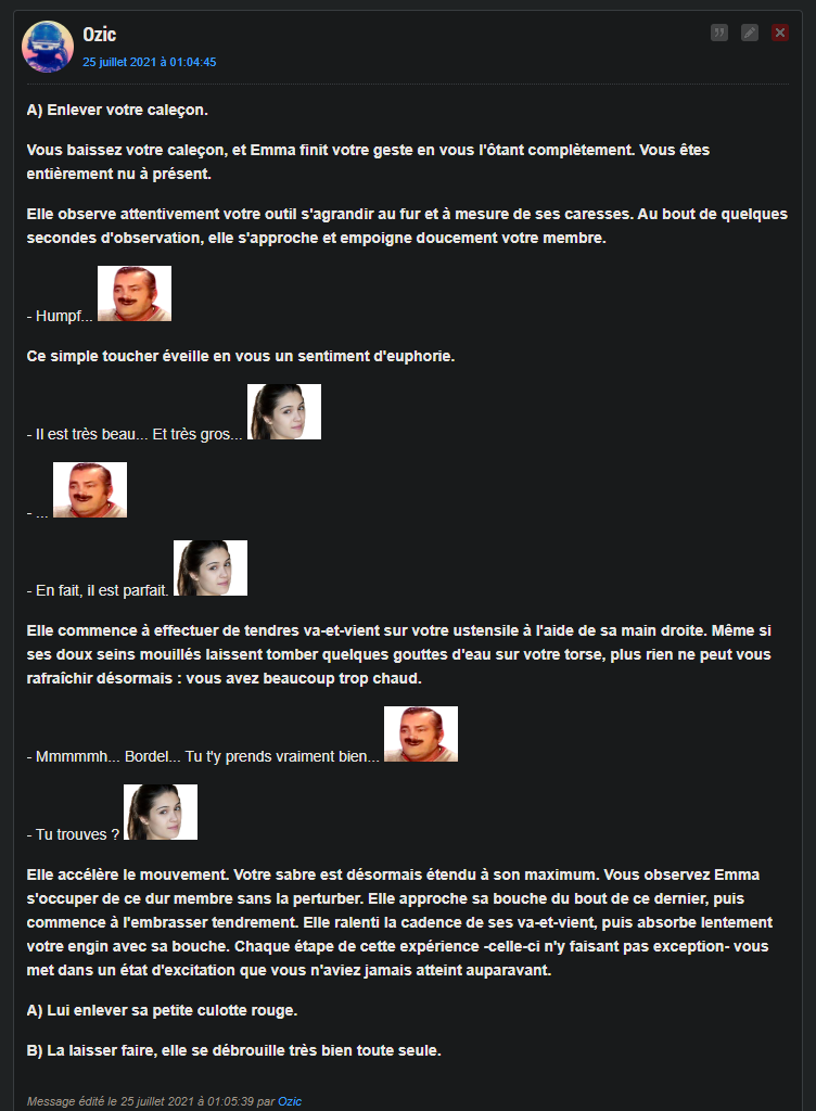 Le 25 juillet 2021 à 01:21:12 :Je lance un défie le dernier qui n'a pas ejaculer gagne une dedi de l'op