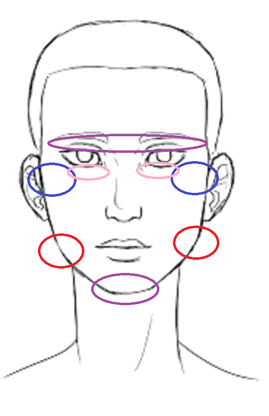 Essentiellement n'importe quel relief osseux, et peut-être même sur les structures molles, ce serait à tester, au niveau du nez, du cou ou du corps. Personnellement je n'ai jamais essayé, il faudra expérimenter. Voici un schéma des zones du visage que l'on peut traiter :