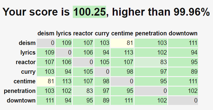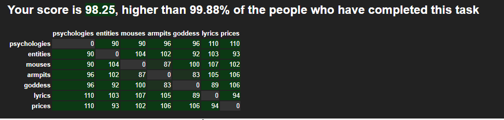 Le 09 août 2021 à 22:06:12 goulouphani a écrit :Your score is 88.59, higher than 94.36% of the people who have completed this taskduodenum cognitive demagogic retaliation rendezvous decapitation pharaohduodenum 0 91 86 95 100 86 94cognitive 91 0 91 90 97 94 99demagogic 86 91 0 80 93 80 85retaliation 95 90 80 0 82 69 91rendezvous 100 97 93 82 0 85 93decapitation 86 94 80 69 85 0 80pharaoh 94 99 85 91 93 80 0