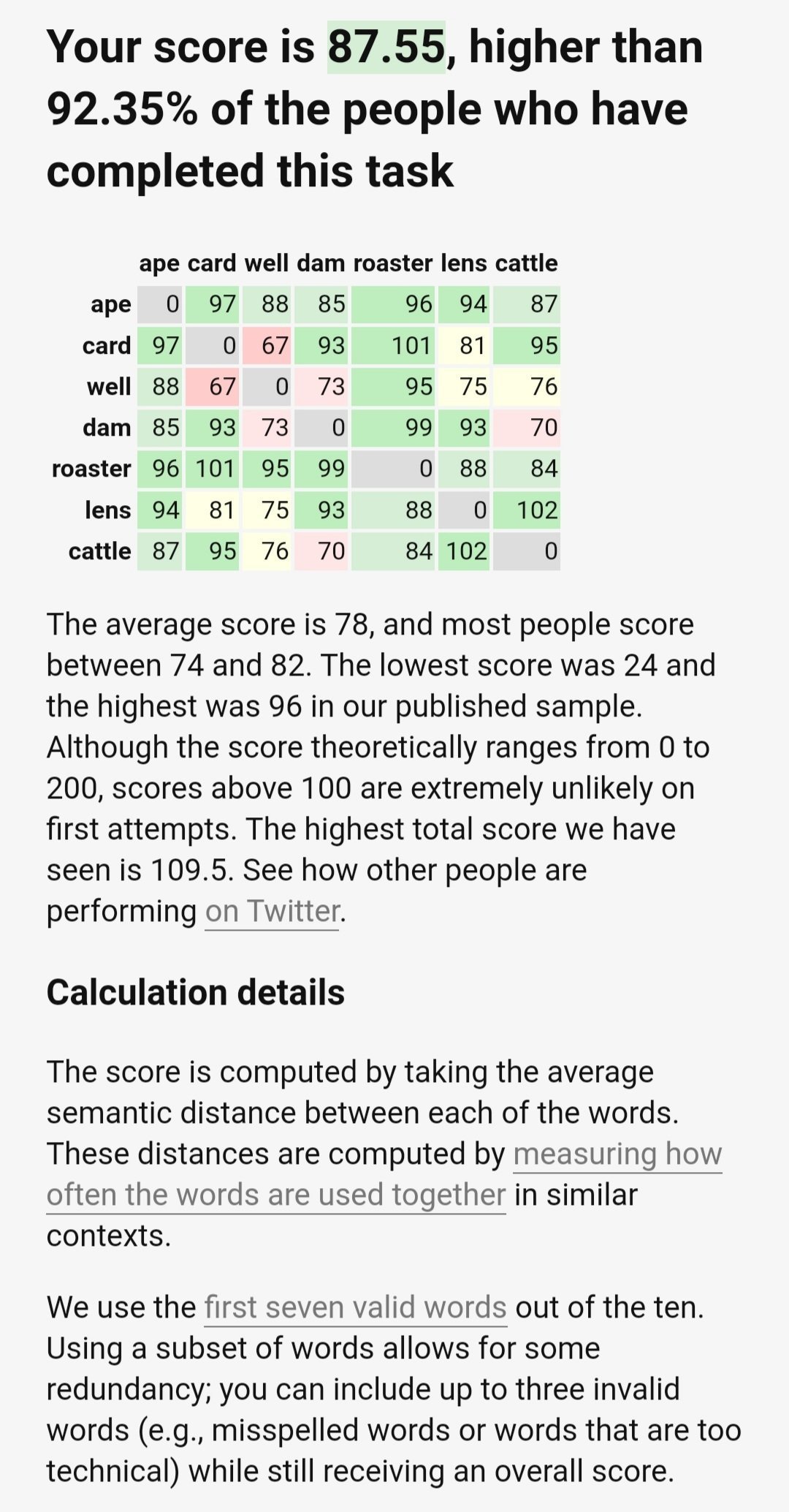 Le but c'est pas de montrer que t'as du vocabulaire en flexant, c'est de trouver des mots au sens lointain. Ton score est cohérent.