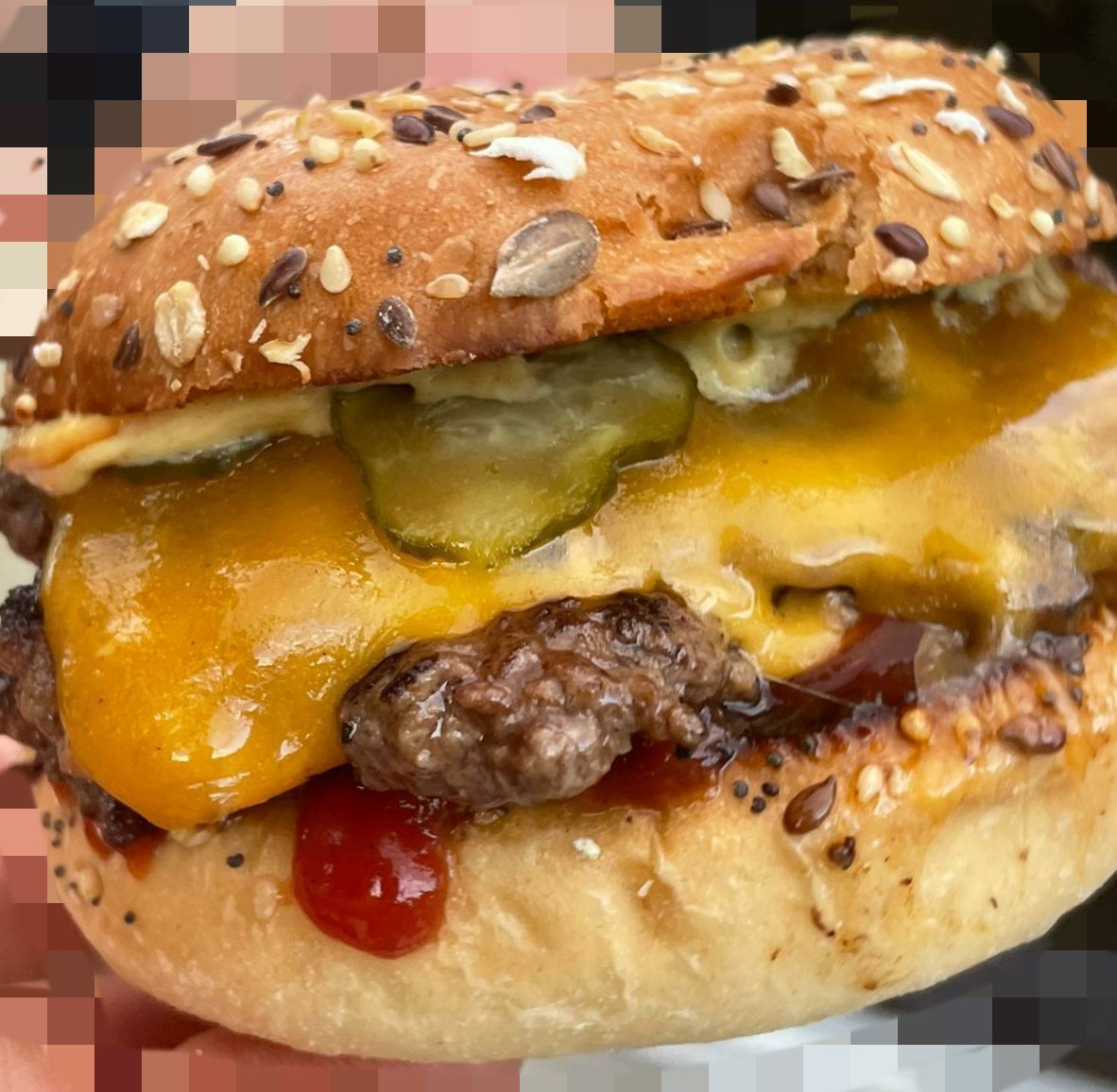Pain toasté au beurre, smash burger à la plancha, cheddar affiné, cornichon aigre-doux, ketchup en bas, moutarde en haut. Simple et efficace mon bon khey