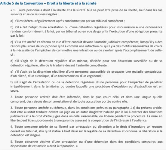 « 1. Toute personne a droit à la liberté et à la sûreté. Nul ne peut être privé de sa liberté, sauf dans les cas suivants et selon les voies légales :