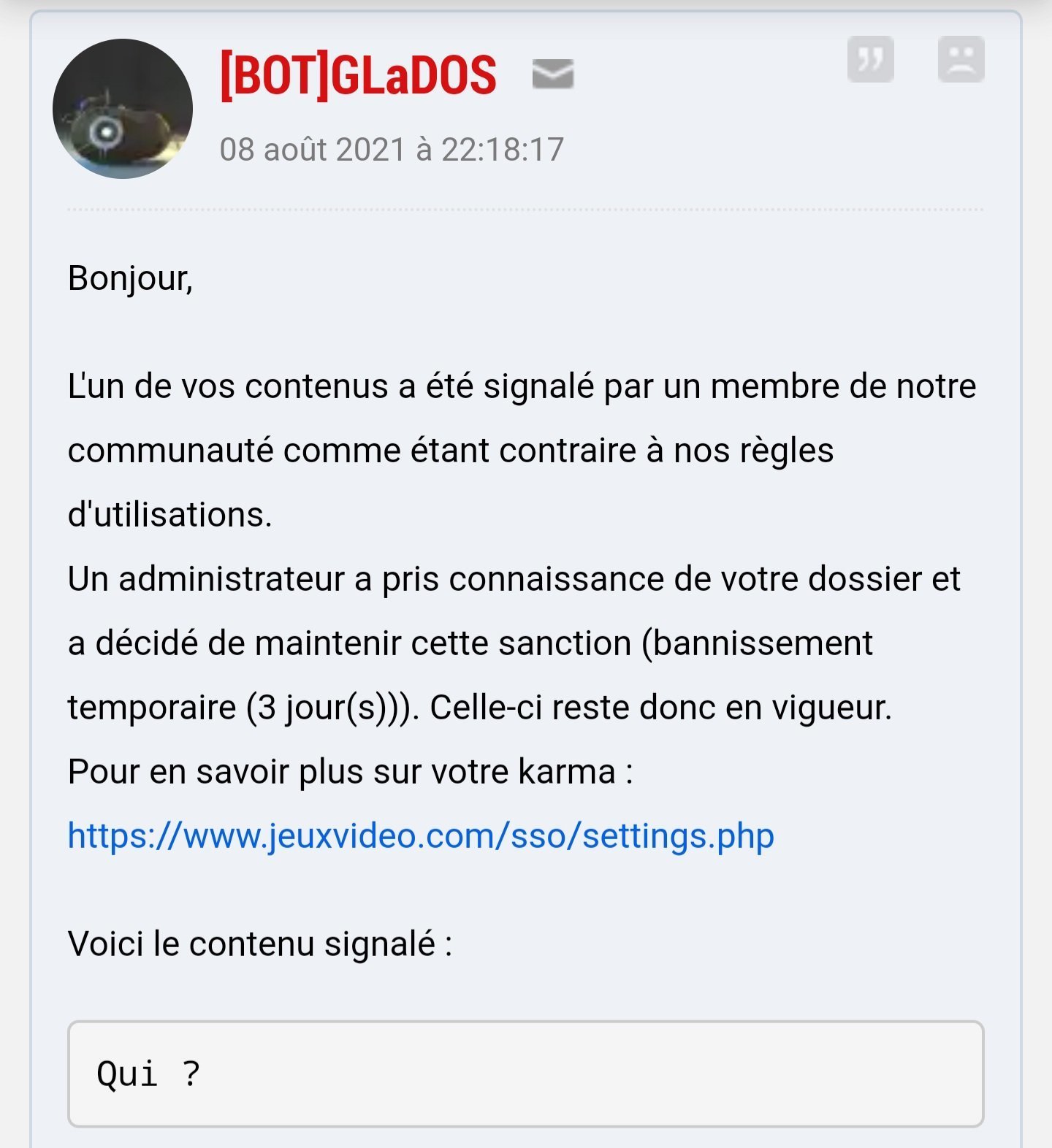 Le 08 août 2021 à 22:31:42 :J'ai été banni 30 jours pour un "ayaa" nofake