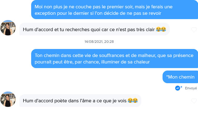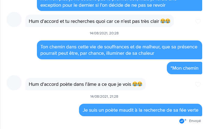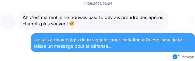 Le 14 ao没t 2021 脿 21:45:52 : L'auteur oblig茅 de faire le clown alors que l'autre chauve, il baise en 2 messages avec des messages explicites d猫s le d茅but, cette putain de blackpill