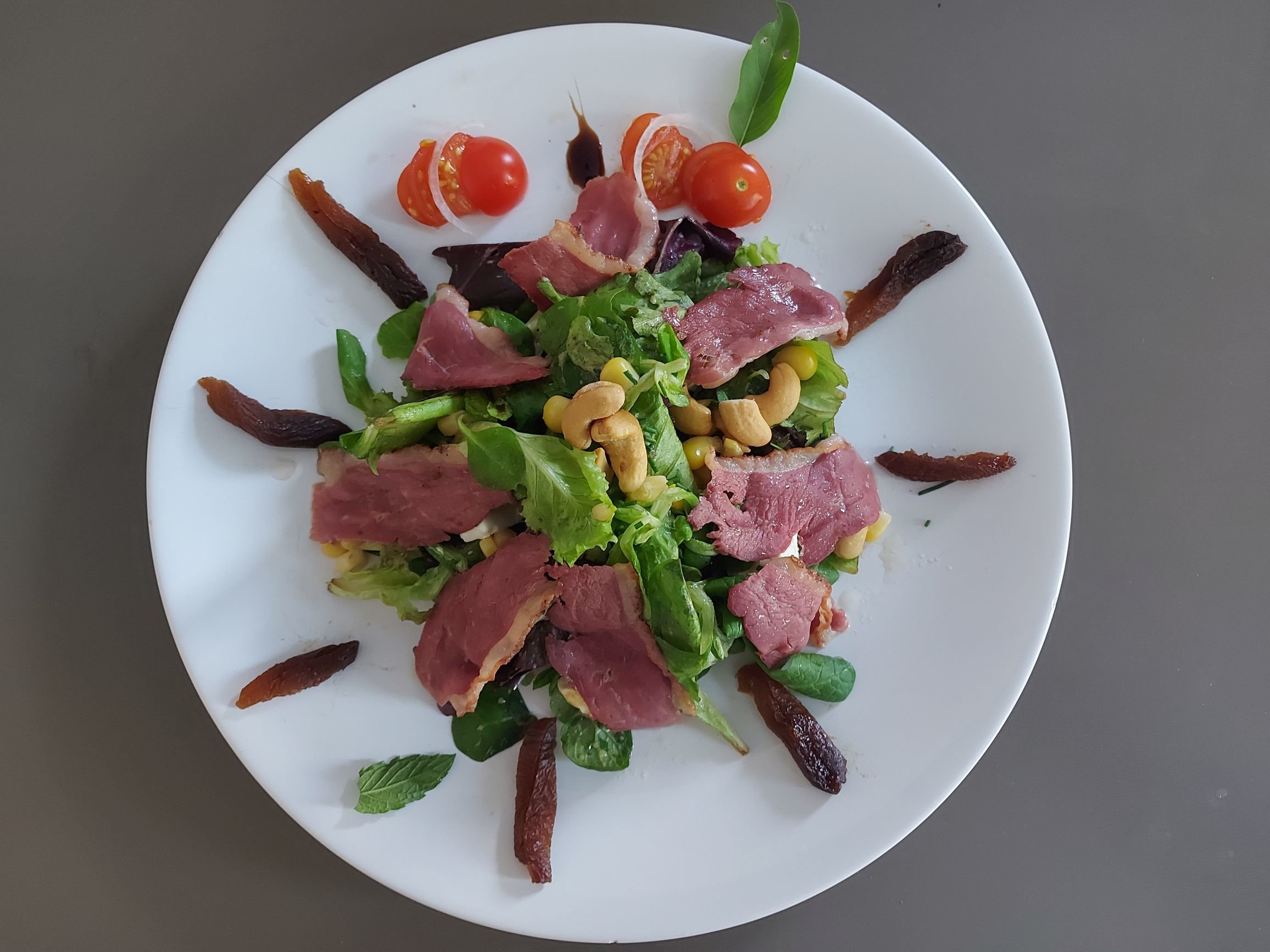 ) Salade du jardin avec des pignons , des noix de cajou, (les limaces autour de l'assiette c'est des abricots secs