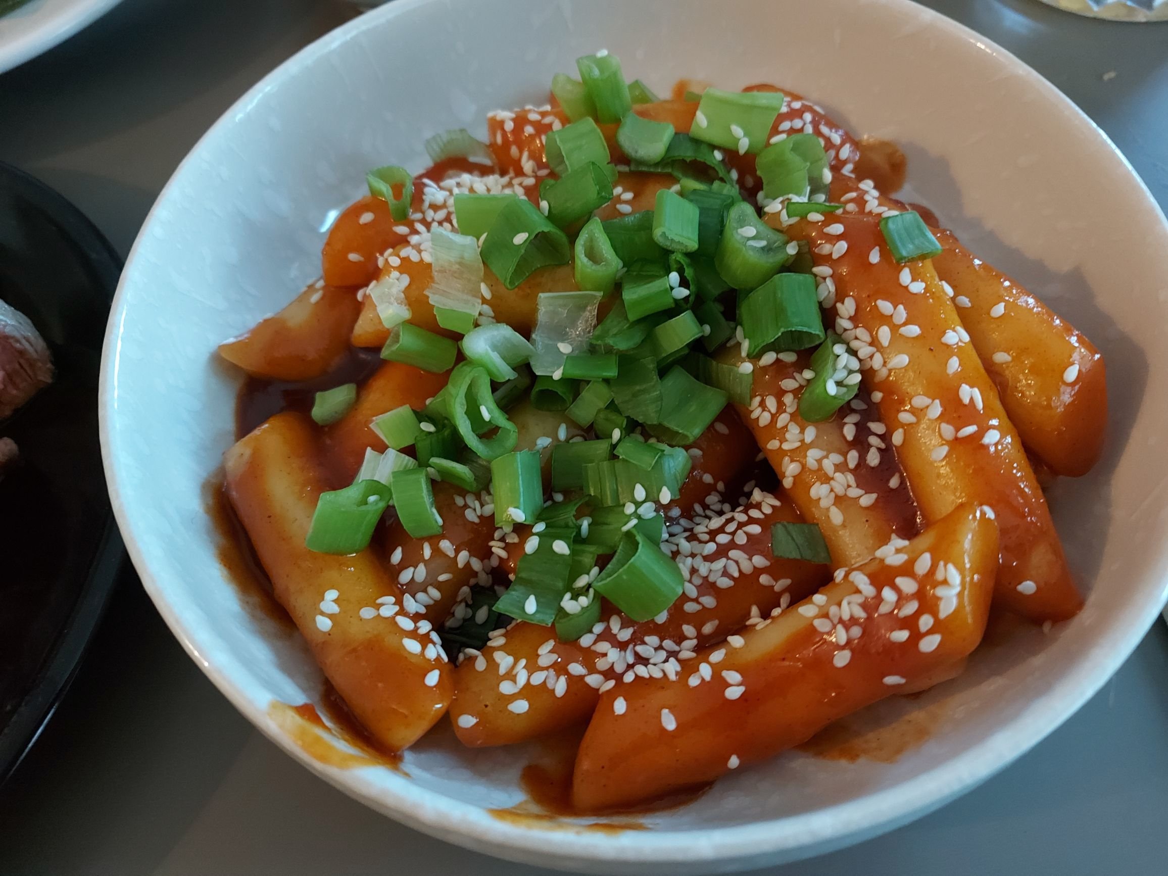Mes Toppoki sauce piquante ! Le toppoki est un plat du pays d'origine de mon épouse, sous forme de petites quenelles de riz enrobées de sauce ultra piquante. (Ya pas de tomates dans la sauce, le rouge est uniquement dû au piment, c'est assez violent).