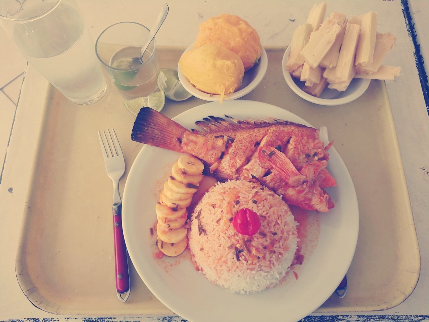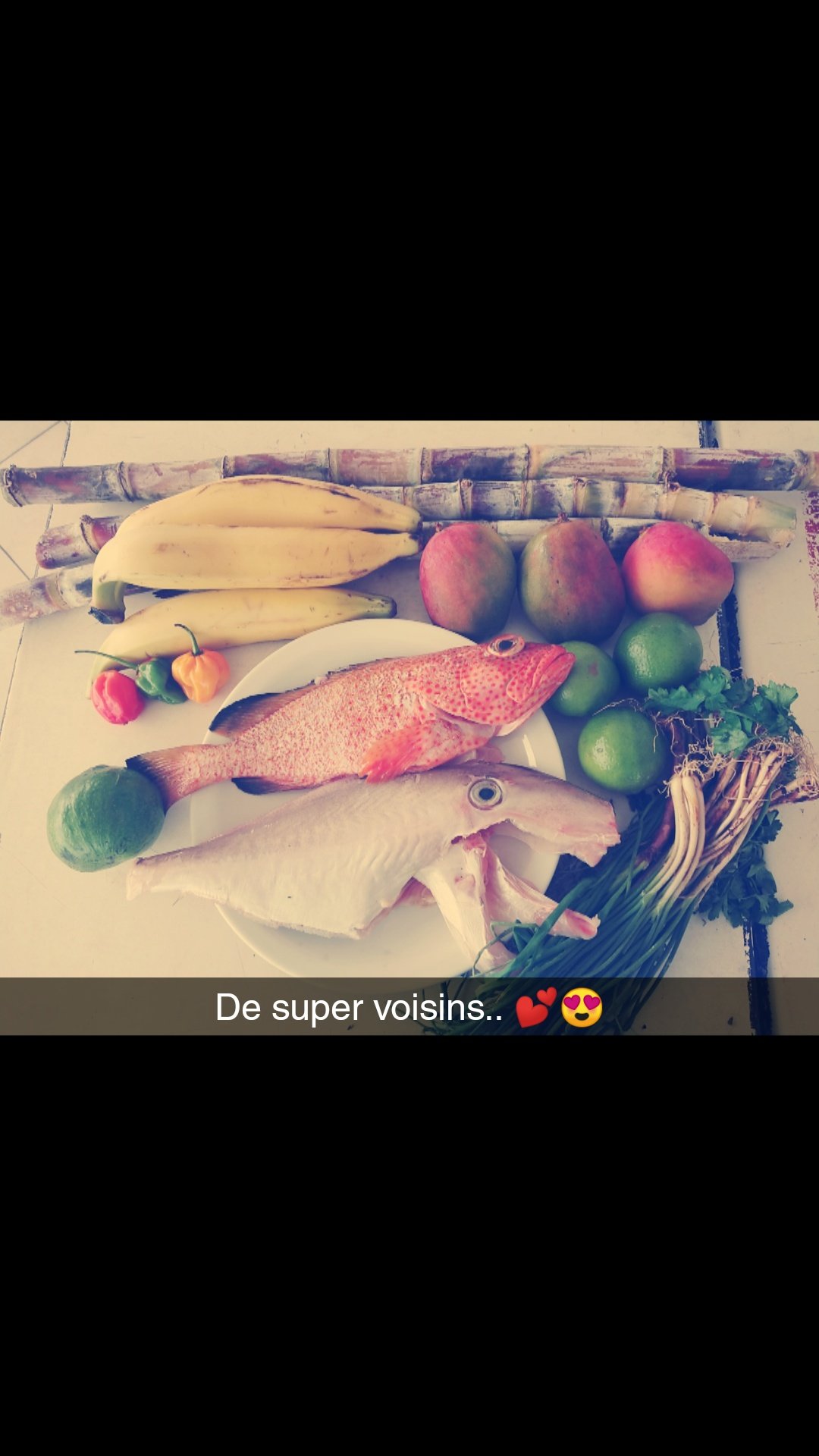 court bouillon de poisson et sa banane plantain , mangue Julie , canne a sucre , petit punch pays , et un verre d'eau de coco du jardin YIIIW !