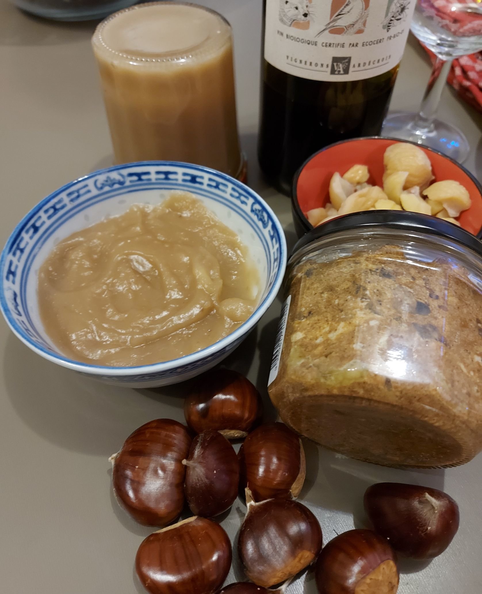 Pour ma part j'ai été ramasser quelques châtaignes, j'ai fait de la confiture et du velouté avec! Je vais accompagner tout ça de pain maison, de paté et de picrate