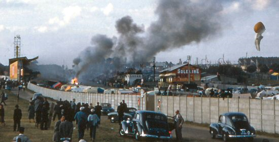 18h28, peu avant la ligne droite des stands, Hawthorn dépasse Levegh et le relègue à un tour, avant de dépasser à l’entrée de la ligne droite une Austin Healey beaucoup plus lente. En voulant dépasser cette Austin Healey de catégorie inférieur, la Jaguar est bien trop rapide pour entrer dans son stand, Hawthorn pille. Lance Macklin, pilote de l’Austin, se fait surprendre par ce blocage de la Jaguar, il fait une embardée sur sa gauche. Levegh arrivait à pleine vitesse, la Mercedes percute l’arrière de l’Austin, s’envole, s’écrase dans le ravin avant d’exploser. L’explosion broie complètement la carcasse et le moteur, qui se décomposent et s’envolent eux aussi. Les débris retombent alors dans le public, Pierre Levegh ainsi que 83 membres du public viennent de perdre la vie, 120 blessés seront aussi recensés. C’est aujourd’hui encore le plus grand drame du sport mécanique toute catégorie confondue, qui à l’époque fut comparée à la tragédie de Farnborough, où le moteur un avion de voltige s’était écrasé dans la foule, fauchant 28 spectateurs.