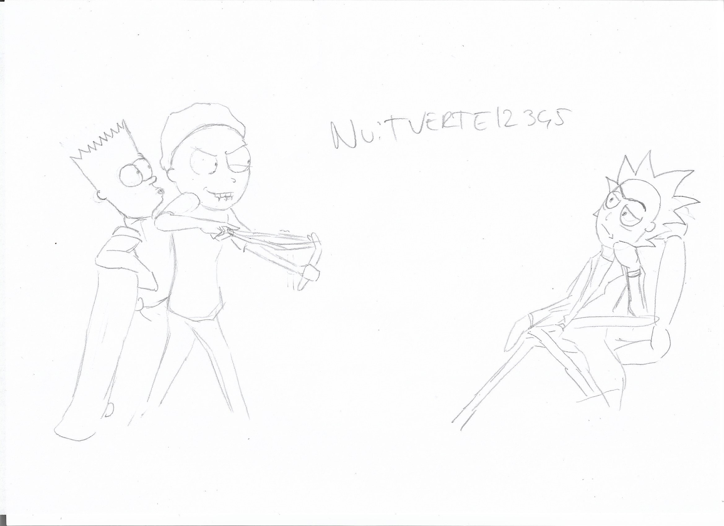 Morty accompagné de Bart (simpsons) qui est en train de viser au lance-pierre Rick. Un khey me l'avait déjà dessiné il y a des années, mais c'est perdu dans mon ancien pc