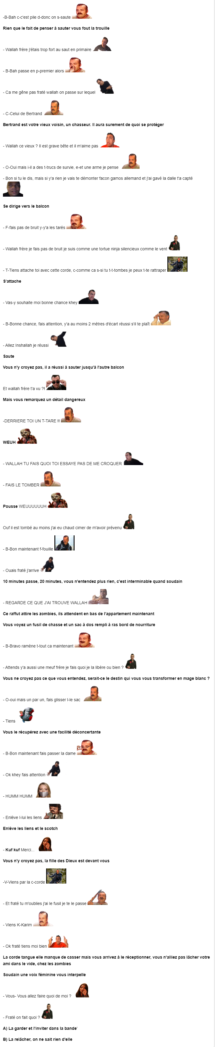 La corde tangue elle manque de casser mais vous arrivez à le réceptionner, vous n'alliez pas lâcher votre ami dans le vide, chez les zombies